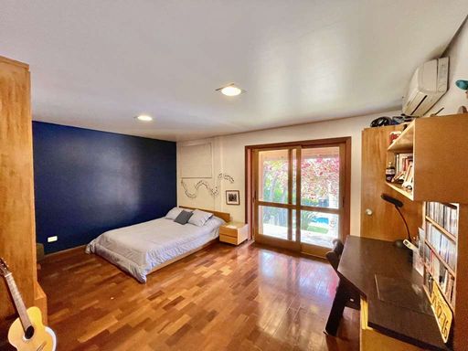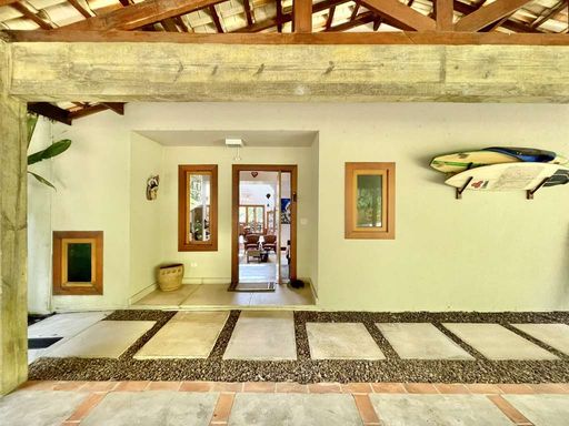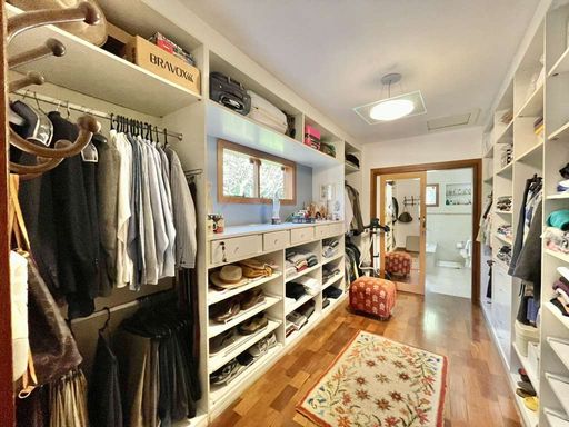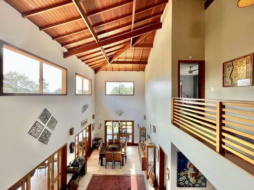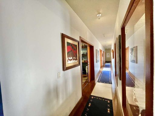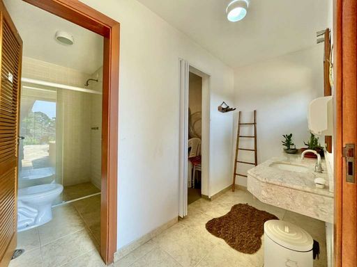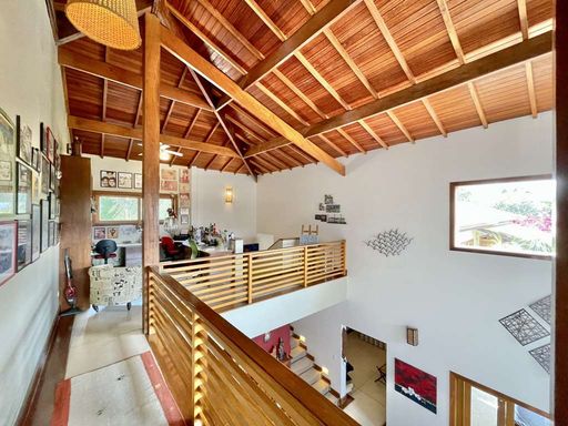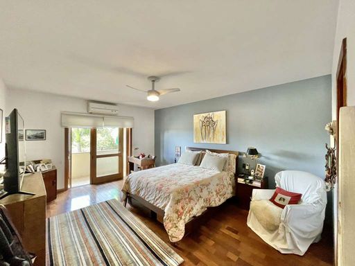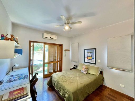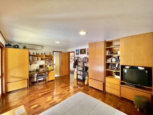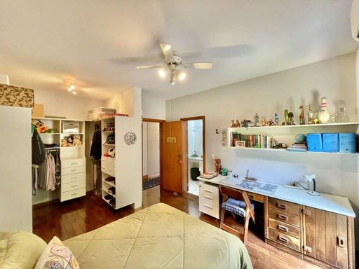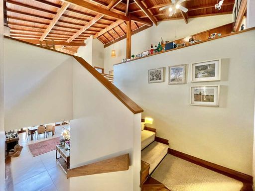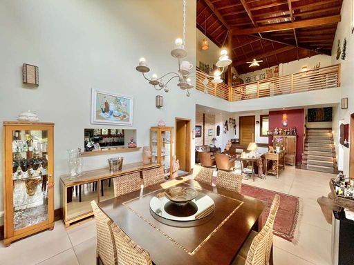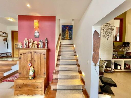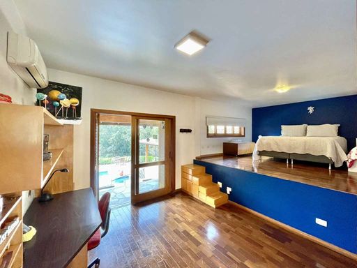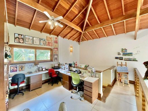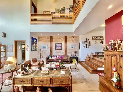O imóvel é repleto de armários planejados e possui portas e janelas em madeira e vidro, além de venezianas e portas balcão nos quartos, que favorecem a iluminação natural. Os pisos combinam porcelanato, cerâmica, tacos de madeira e pedra, trazendo elegância e aconchego a cada ambiente. O hall de entrada social conduz ao lavabo com tampo em pedra e pequeno jardim, enquanto a escada iluminada, revestida em madeira e com corrimão no mesmo material, leva ao mezanino com guarda-corpo de madeira. O home office, completo em armários e com ventilador de teto, é ideal para escritório, biblioteca ou espaço de estudos.