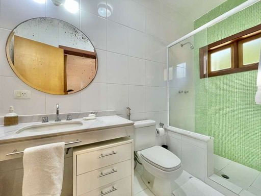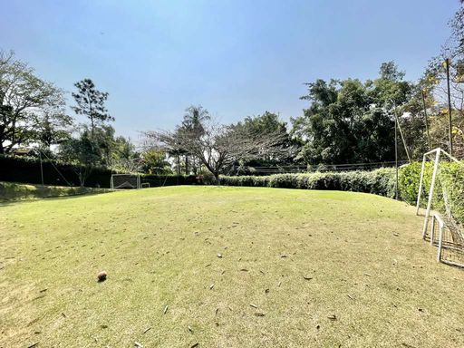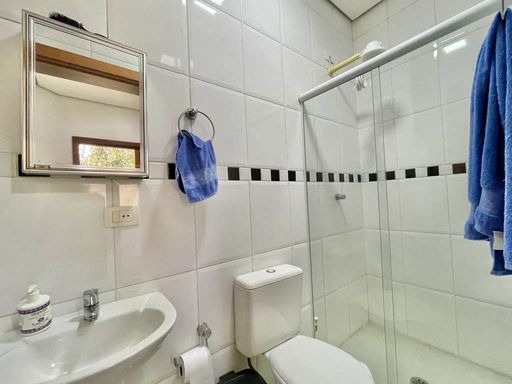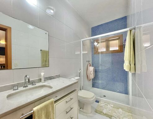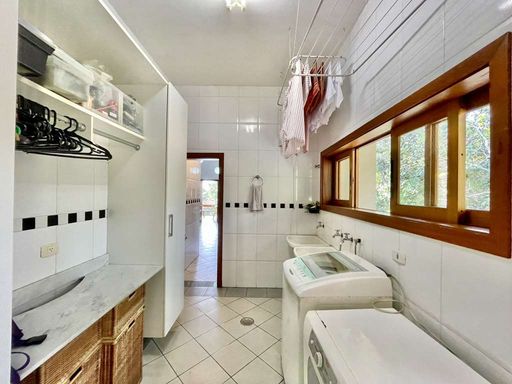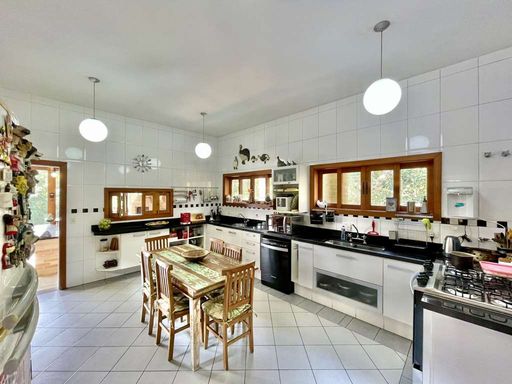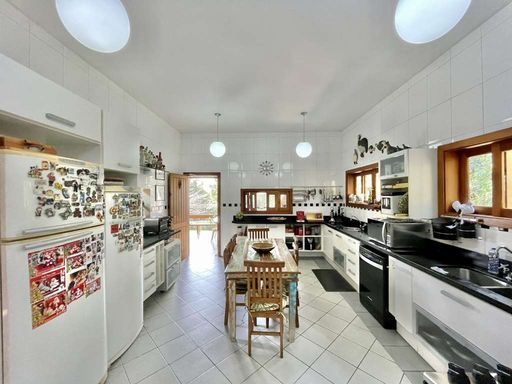 A área externa oferece ainda vestiário, campinho de futebol, depósito e garagem para seis veículos, sendo três vagas cobertas. A cozinha planejada, com sala de almoço, armários e bancadas em granito com cuba inox, conecta-se à área de serviço ensolarada, lavanderia fechada e dependências de serviço.