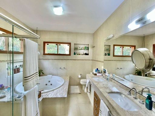 Na área íntima, há um hall com roupeiro e quatro suítes amplas. A master é um verdadeiro refúgio, com closet, sala íntima, escritório, pátio privativo e banheiro com duas cubas, hidro redonda dupla, espelho, box de vidro e acabamentos em mármore. O living possui pé-direito alto e acomoda até cinco ambientes integrados – estar, jantar, lareira, bar e TV – todos voltados para a varanda gourmet e para a piscina aquecida, com prainha, hidro e solarium. A varanda em “L” conta com churrasqueira, forno de pizza, balcão e bancada em inox, perfeita para receber convidados.