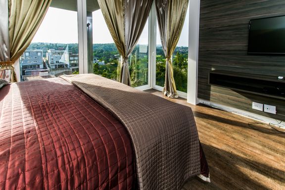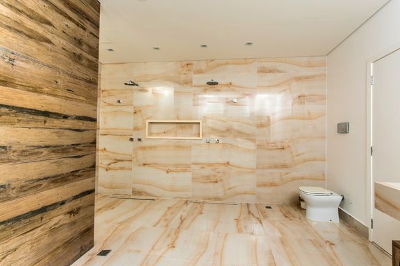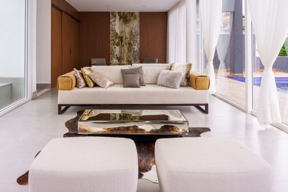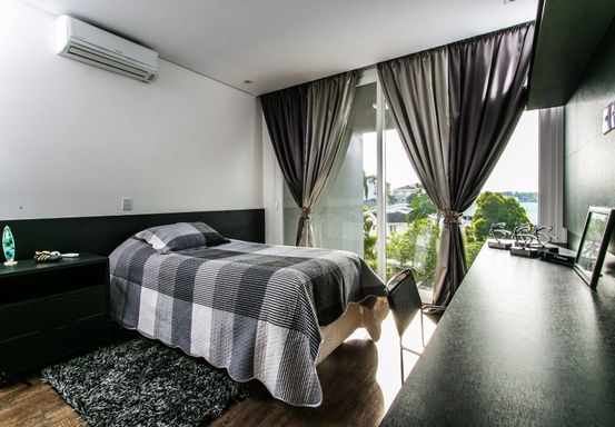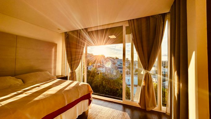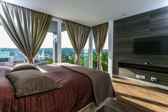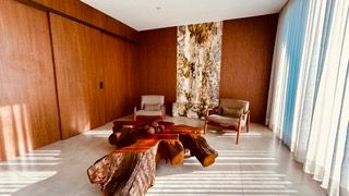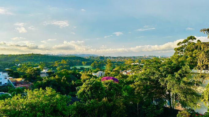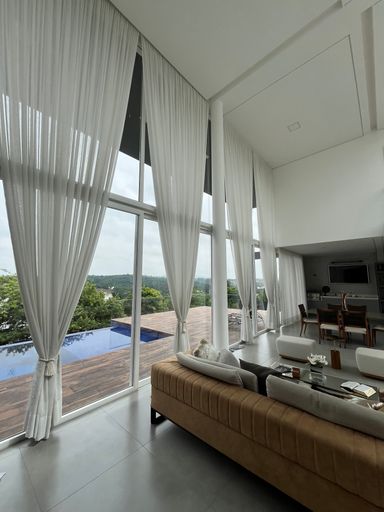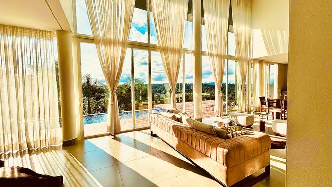 O imóvel oferece 4 suítes amplas e confortáveis, além de 7 banheiros completos e um lavabo. Conta também com quarto de serviço, garantindo praticidade no dia a dia. A área social é espaçosa e elegante, com living de pé-direito duplo, lareira e grandes aberturas que proporcionam iluminação natural abundante e uma vista privilegiada para a mata.
