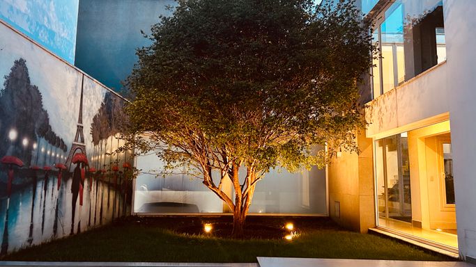 Um charmoso espaço relax com jabuticabeira reforça a conexão com a natureza, trazendo tranquilidade ao dia a dia. A garagem comporta até 9 veículos, sendo 3 vagas cobertas.