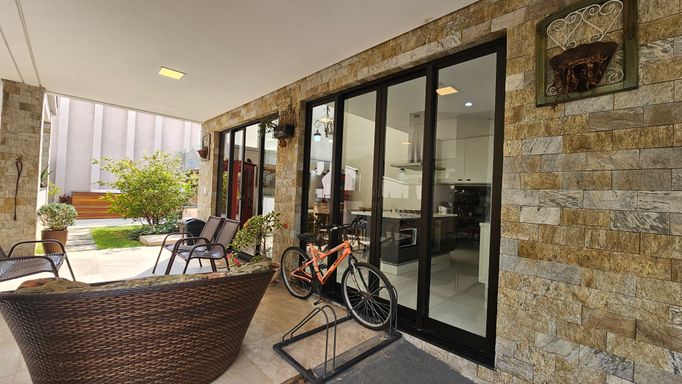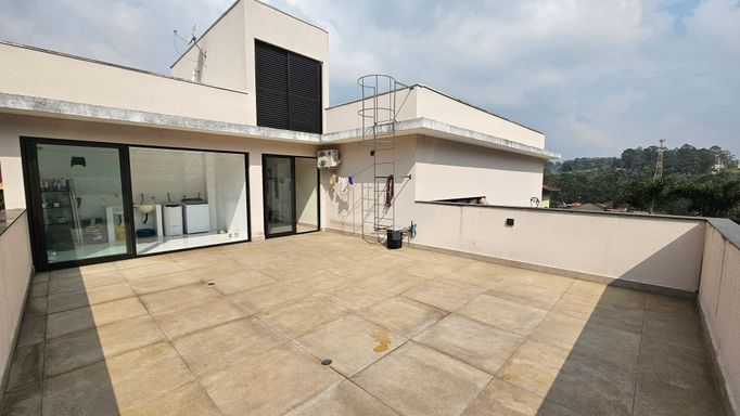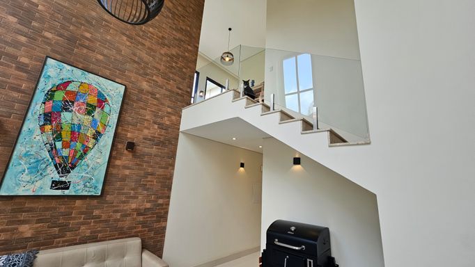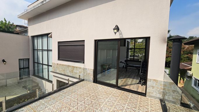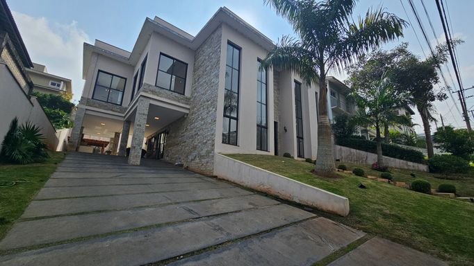 Casa de alto padrão à venda no Residencial Parque das Artes, na Granja Viana, com 361 m² de área construída em um terreno de 600 m². Projetada com arquitetura moderna e linhas marcantes, a residência combina sofisticação e conforto em cada detalhe. Logo na entrada, o pé-direito elevado da sala principal impressiona e revela dois ambientes amplos e integrados, um deles com lareira, cercados por grandes painéis de vidro que garantem iluminação natural e uma atmosfera acolhedora.
