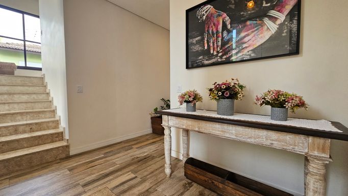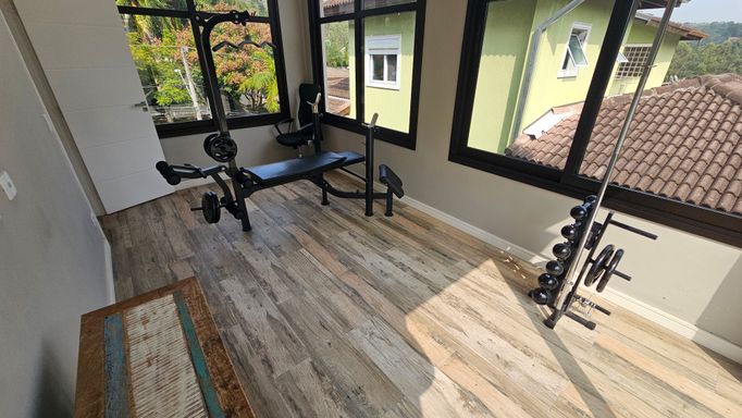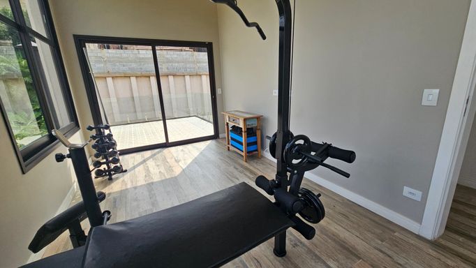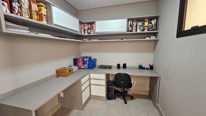 O segundo andar oferece ainda mais versatilidade, com sala íntima, dormitório com banheiro e uma academia envidraçada que pode ser adaptada como estúdio, home theater ou espaço zen. Já o último pavimento traz privacidade e funcionalidade, com escritório completo em planejados, mais um dormitório climatizado, lavanderia fechada em vidro e varanda panorâmica com vista privilegiada.