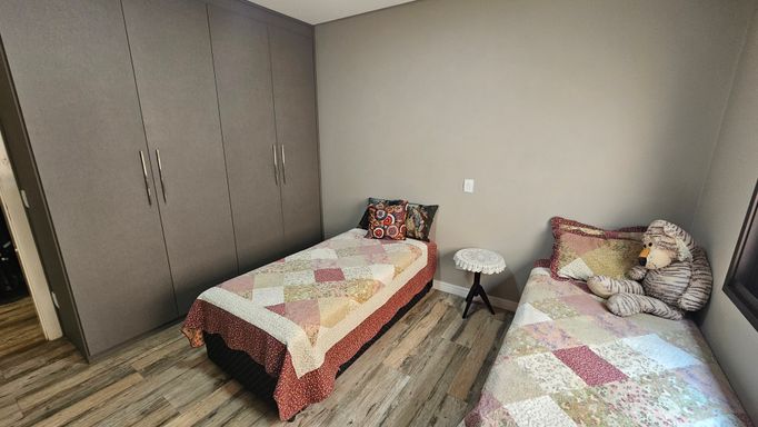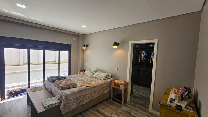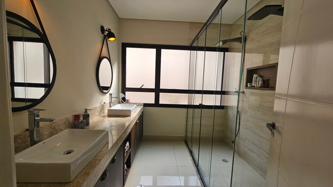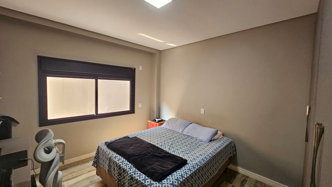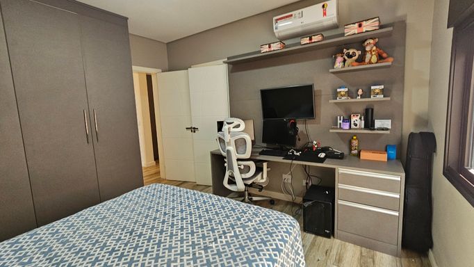 No primeiro andar, encontram-se duas suítes americanas – uma delas com ar-condicionado – que compartilham banheiro com acabamento refinado e armários planejados. A suíte master é um refúgio exclusivo: amplo closet, ar-condicionado, banheiro com cuba e chuveiro duplos, além de varanda privativa integrada diretamente à área de lazer.