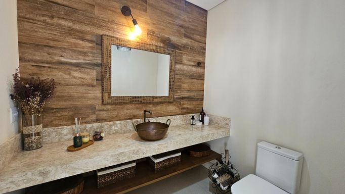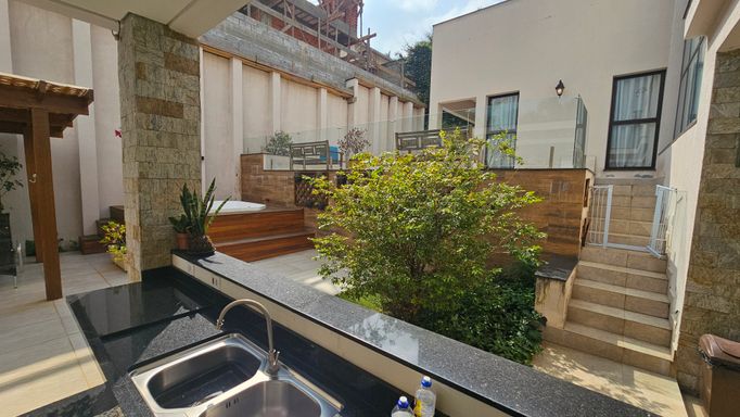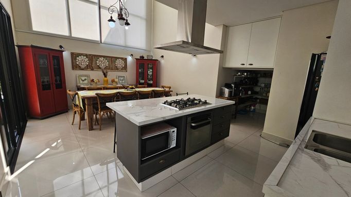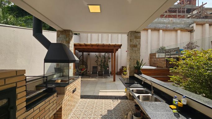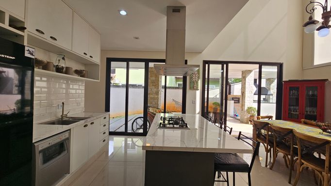 A cozinha planejada, equipada com móveis sob medida e generosa despensa, conecta-se de forma harmoniosa à elegante área gourmet. O espaço externo é um convite ao lazer e à convivência, com churrasqueira, gazebo e ofurô, projetados para receber amigos e familiares com estilo e praticidade.