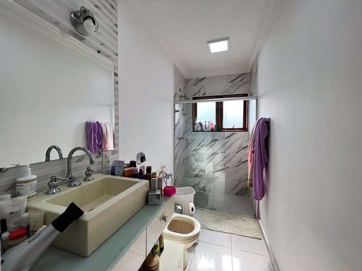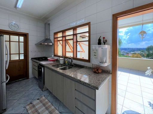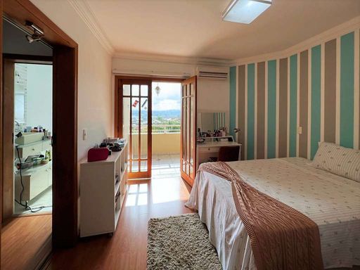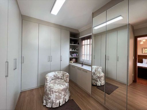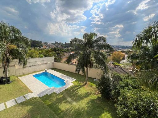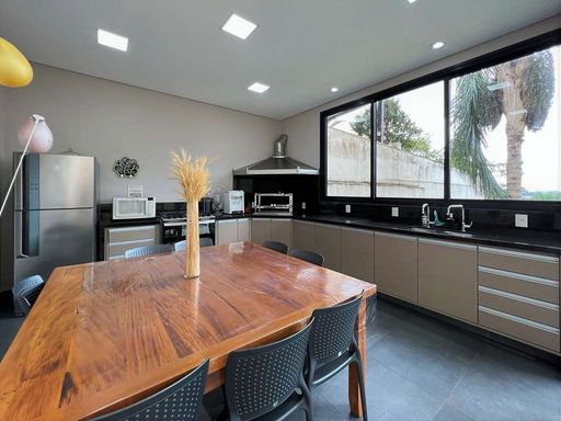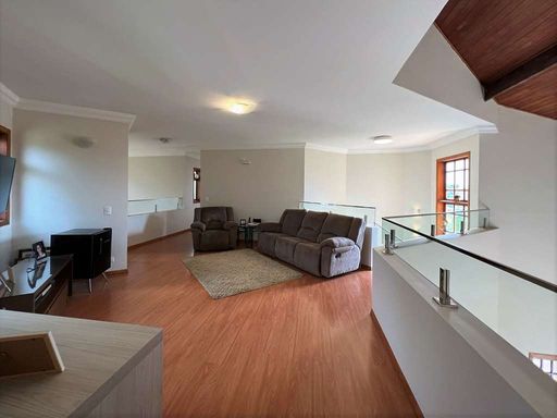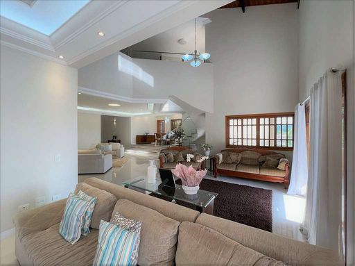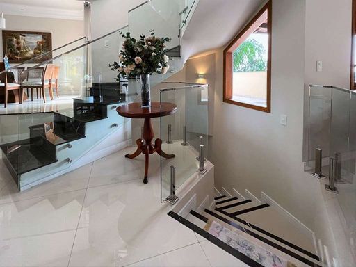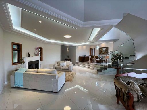 A área íntima conta com quatro dormitórios, todos com armários, sendo um deles voltado para hóspedes e três suítes equipadas com closet, varanda e ar-condicionado. A suíte master se destaca pelo closet maior e pela varanda com vista aberta, além de um banheiro sofisticado, com hidromassagem dupla, duas cubas e bancada em mármore Travertino. No térreo, o living de pé-direito alto integra quatro ambientes — estar, lareira, jantar em desnível e TV — todos orientados para o terraço e para uma varanda com uma vista encantadora. A cozinha, ampla e funcional, possui sala de almoço, duas bancadas, armários planejados, pia em inox e despensa. A área de serviço completa-se com lavanderia fechada, dependências de empregada e um espaço externo ensolarado.