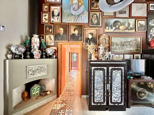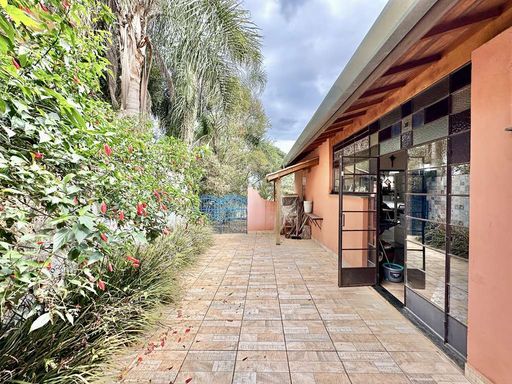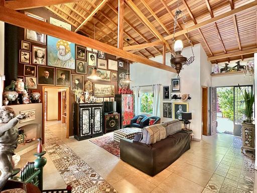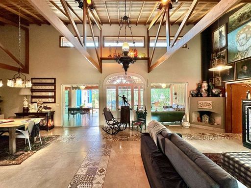 Com acabamentos diferenciados, que unem vitrais, portas e janelões em madeira e vidro – alguns bisotados – e materiais de demolição cuidadosamente reaproveitados, a casa carrega o charme de uma construção única. O pé-direito alto, a integração dos ambientes e a abundante iluminação natural reforçam a sensação de amplitude e bem-estar. O living é amplo e acolhedor, com cinco ambientes interligados – estar, jantar, TV, lareira e bar – todos voltados para a varanda que emoldura a vista para o jardim.