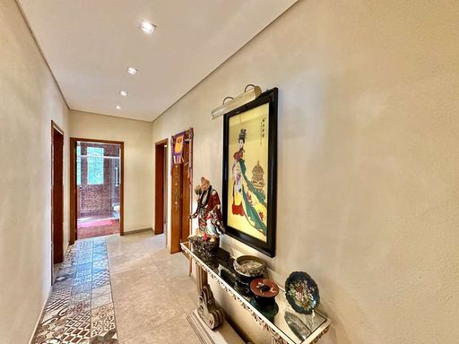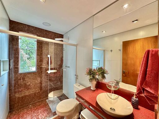 Na ala íntima, três dormitórios, sendo uma suíte com closet planejado, garantem conforto e privacidade. Os banheiros possuem acabamentos refinados em mármore e silestone, box de vidro, gabinetes e nichos. A área externa é um convite à contemplação: jardim com árvores frutíferas, horta, pátio charmoso com estátuas e espaço para ofurô, além de solarium que valoriza os momentos ao ar livre.