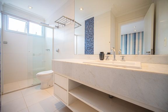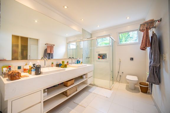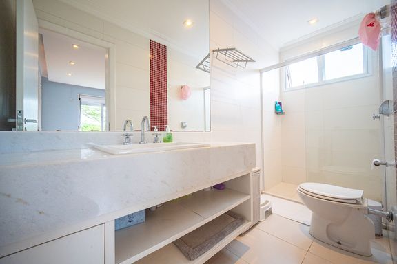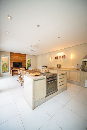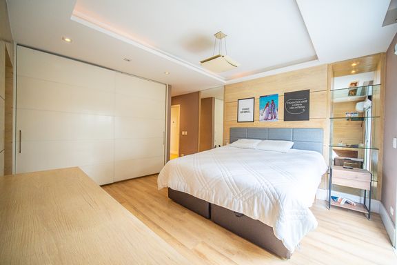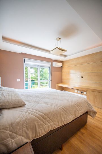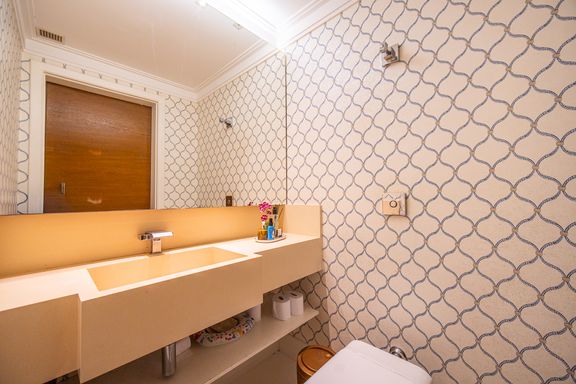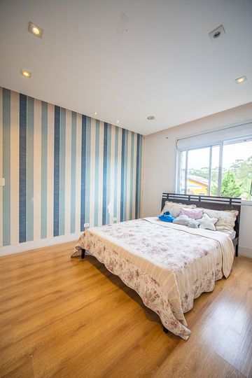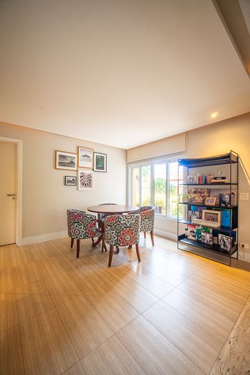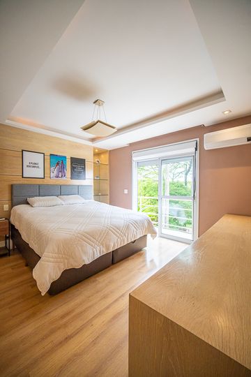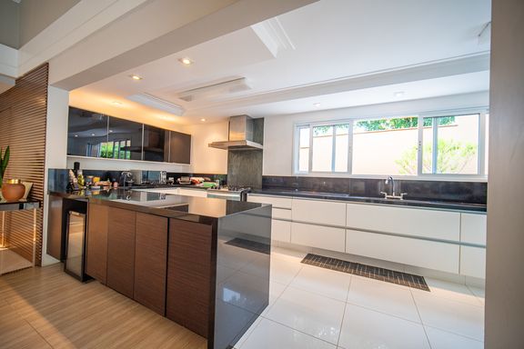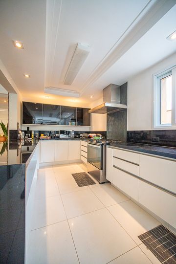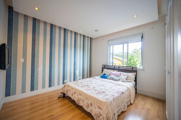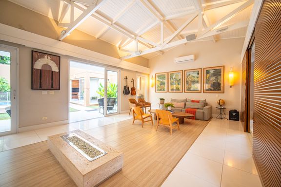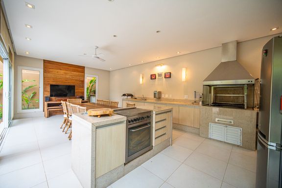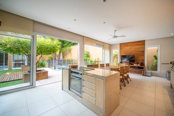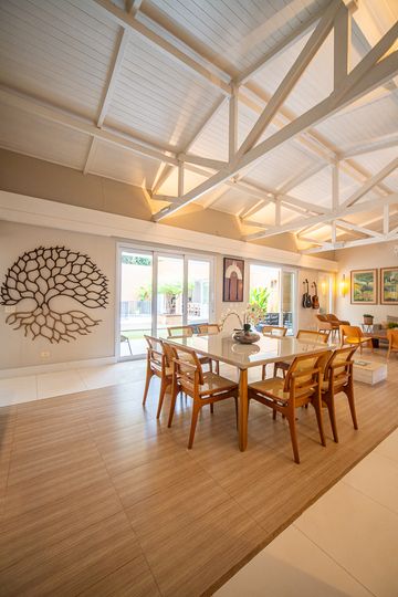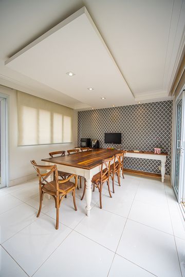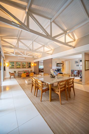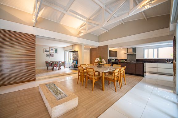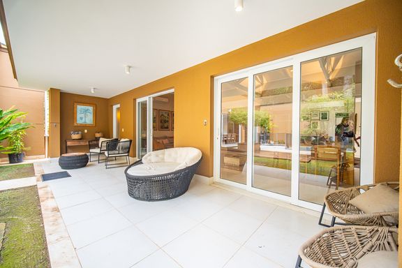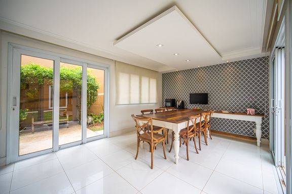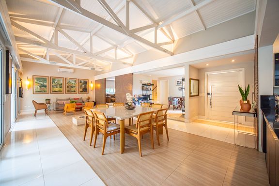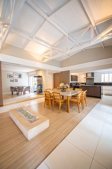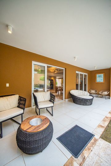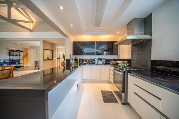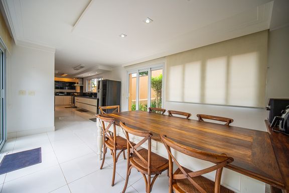 O living reúne salas espaçosas e aconchegantes, valorizadas por uma lareira a gás que traz sofisticação e conforto. São 4 suítes, todas generosas em tamanho, com destaque para a suíte master, que conta com closet, banheira de hidromassagem e varanda privativa, oferecendo um verdadeiro refúgio de descanso. A cozinha é ampla e funcional, com balcão em granito, integrada à sala de almoço e com acesso direto ao quintal, facilitando o dia a dia e os momentos de convivência.