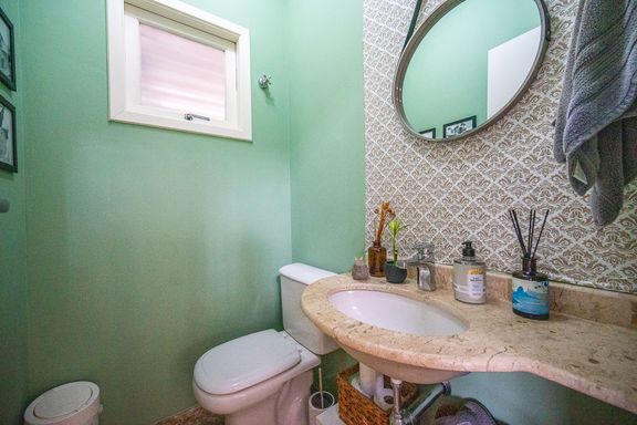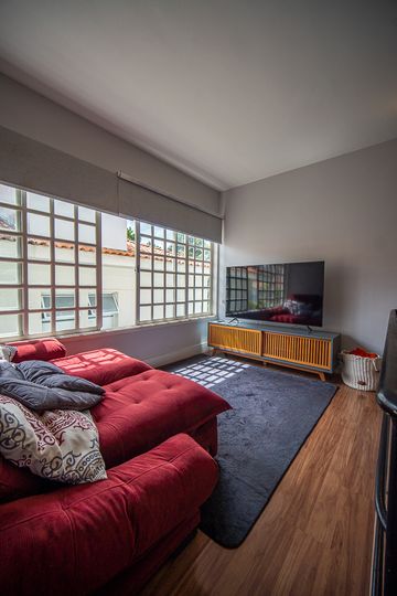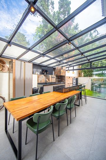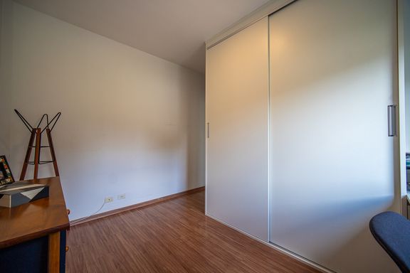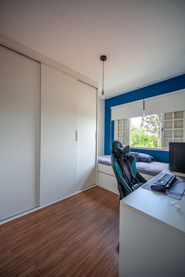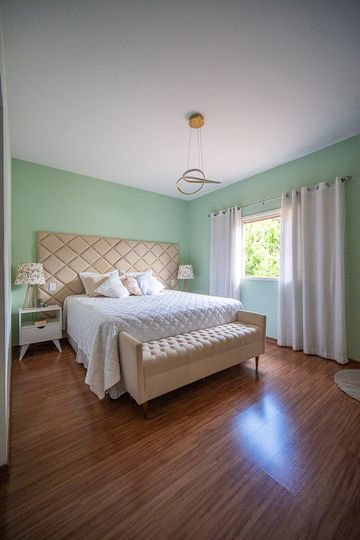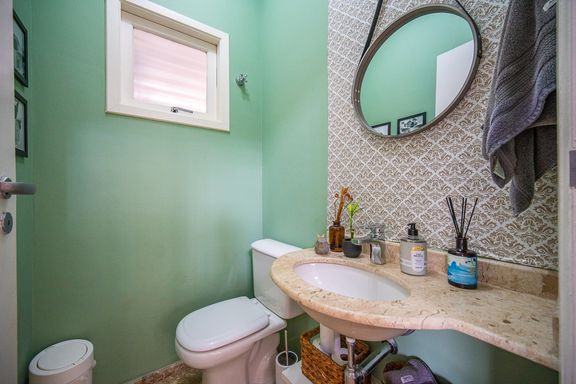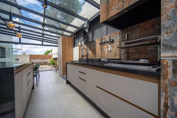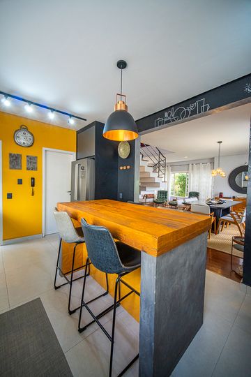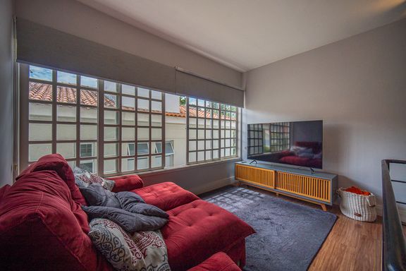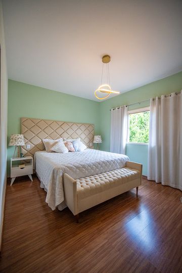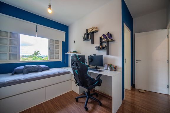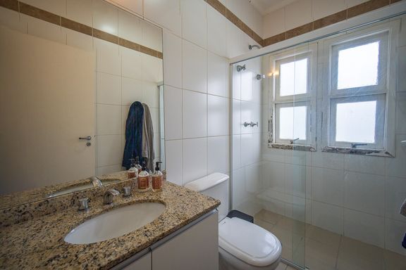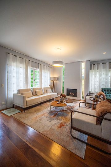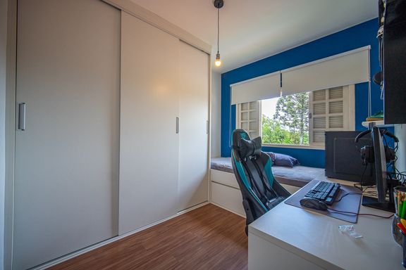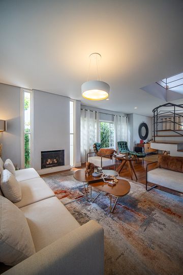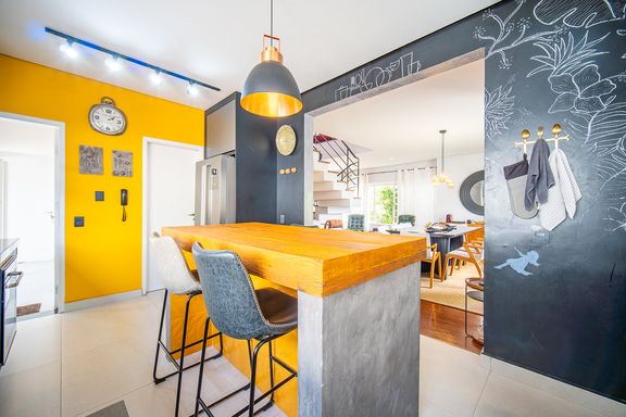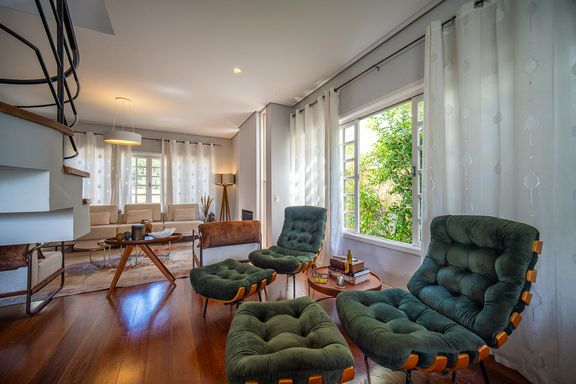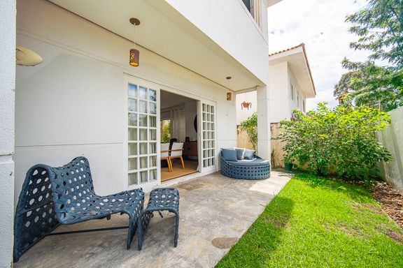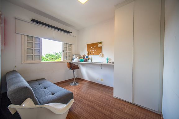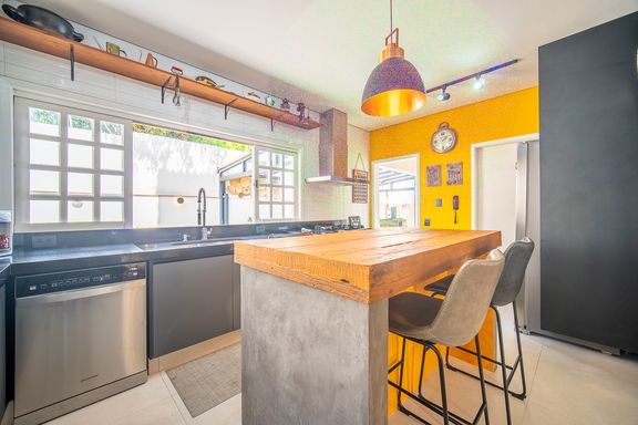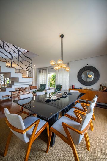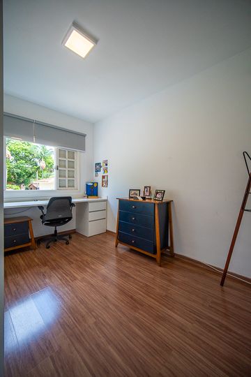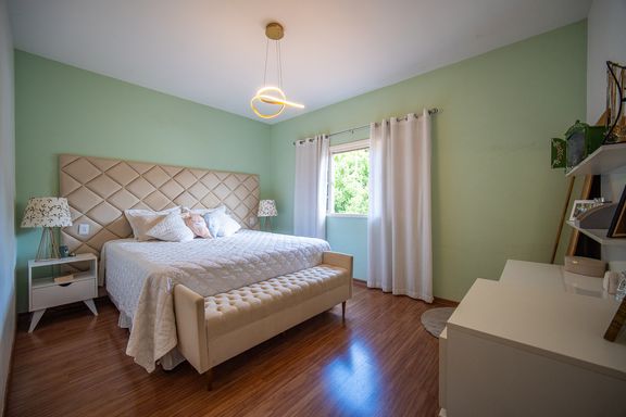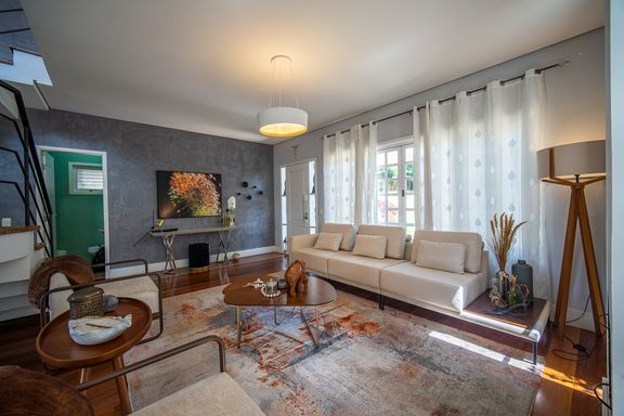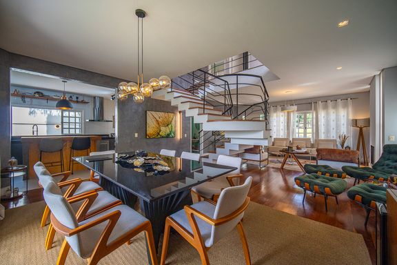 O living é espaçoso e integrado para três ambientes, com sala de estar, sala de jantar e sala de TV, além de lareira que traz aconchego aos momentos em família. A cozinha em conceito aberto possui armários planejados e acabamentos modernos, conectando-se harmoniosamente à área social. O imóvel dispõe ainda de escritório, lavabo, área de serviço reservada e água quente, agregando funcionalidade ao dia a dia.