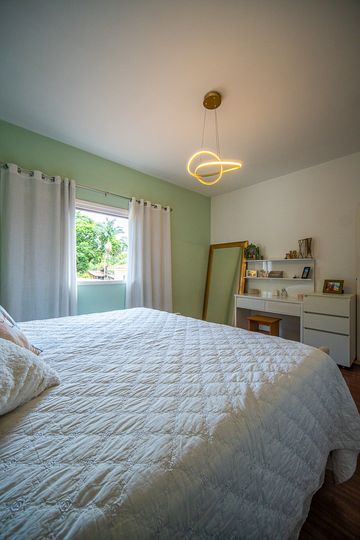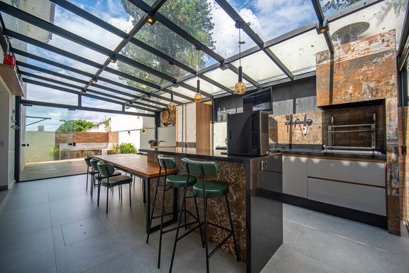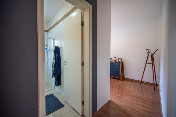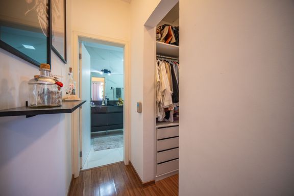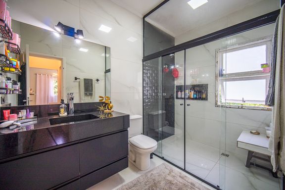 Implantada em um terreno de 457 m², com 240 m² de área privativa, a residência apresenta projeto arquitetônico que prioriza integração, funcionalidade e iluminação natural. São quatro dormitórios, todos suítes, garantindo conforto e privacidade para toda a família. A suíte master é um verdadeiro refúgio, com amplo closet e sauna privativa, criando um ambiente exclusivo de relaxamento. Ao todo, o imóvel conta com cinco banheiros, distribuídos de forma inteligente para atender às áreas social e íntima com praticidade.