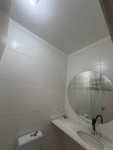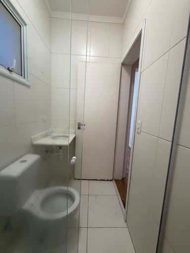 A cozinha americana também conta com revestimento cerâmico até o teto, oferecendo praticidade e fácil manutenção, além de integração com o living. A área de serviço e lavanderia seguem o mesmo padrão de acabamento, garantindo organização no dia a dia.