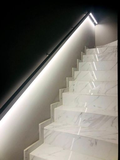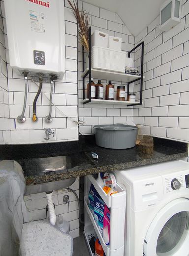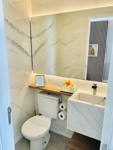 No térreo, o lavabo complementa a área social, combinando com o estilo do restante da casa e oferecendo praticidade para visitantes e moradores.
