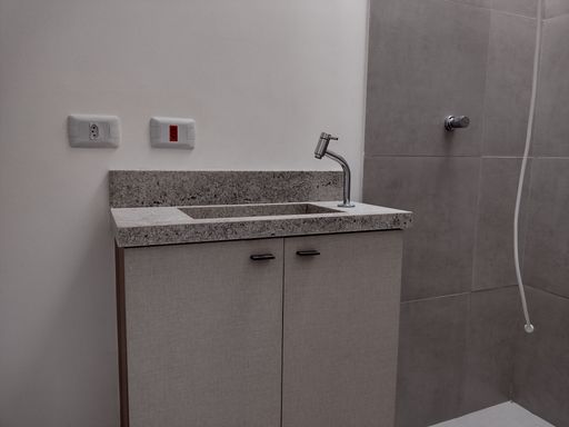 O banheiro no piso superior é claro e bem ventilado, graças à presença de uma claraboia que permite a entrada de luz natural. Equipado com armário e box de vidro, o banheiro atende perfeitamente às necessidades dos moradores, oferecendo funcionalidade e estilo.
