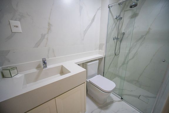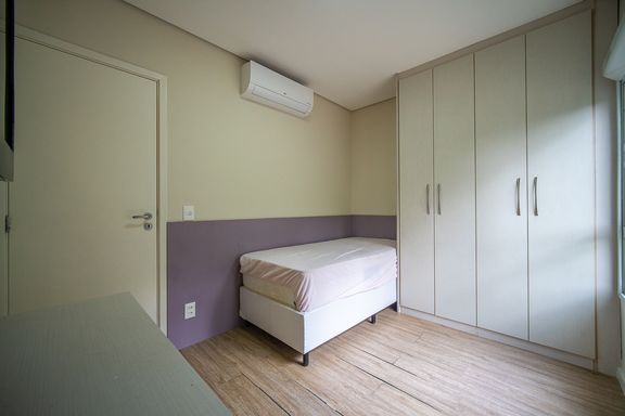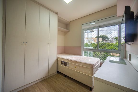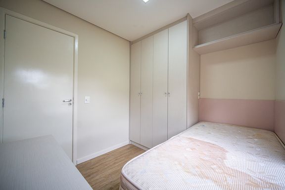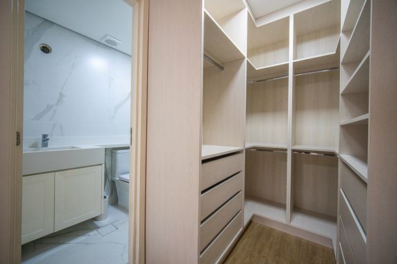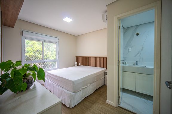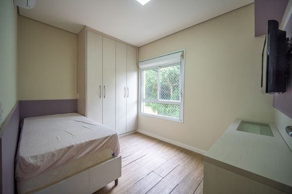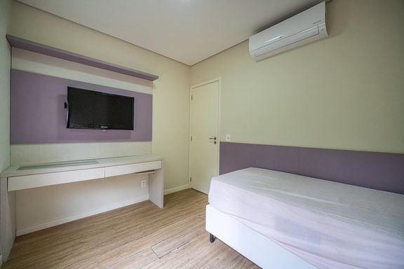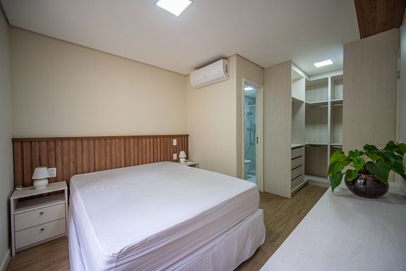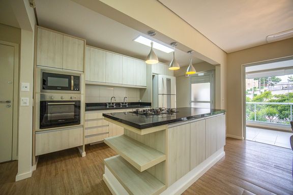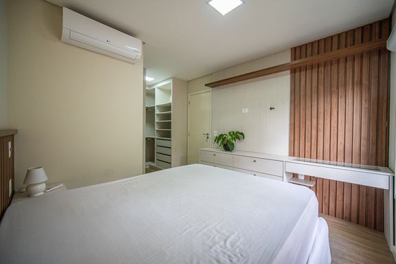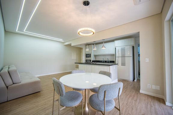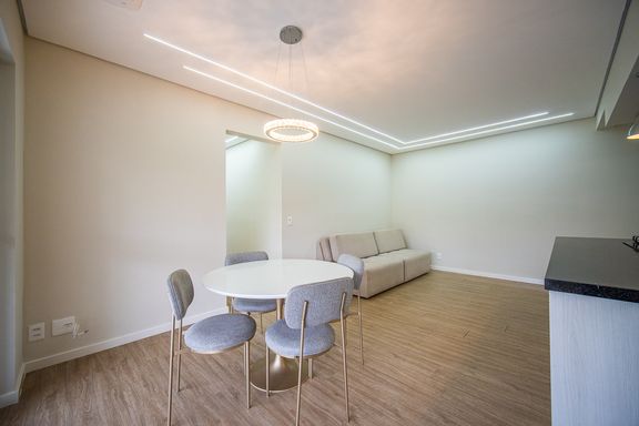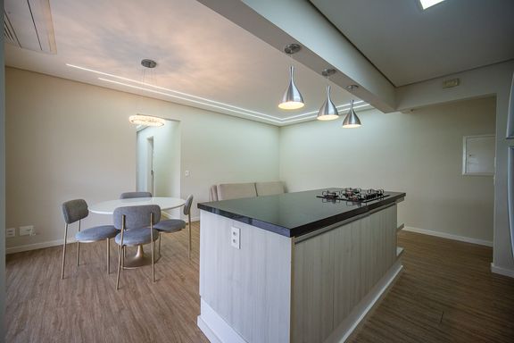 A area social é composta por ampla sala integrada, com sala de TV e sala de jantar, proporcionando um espaço agradável para convivência. A cozinha americana é planejada e funcional, contando com armários embutidos e excelente aproveitamento de espaço.