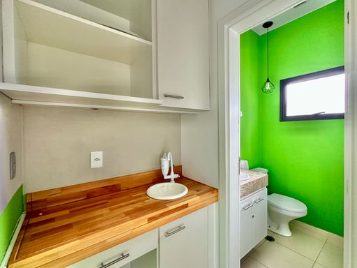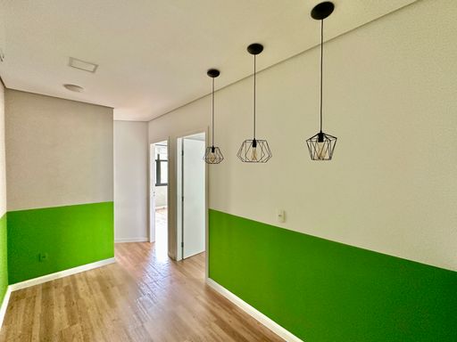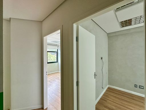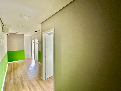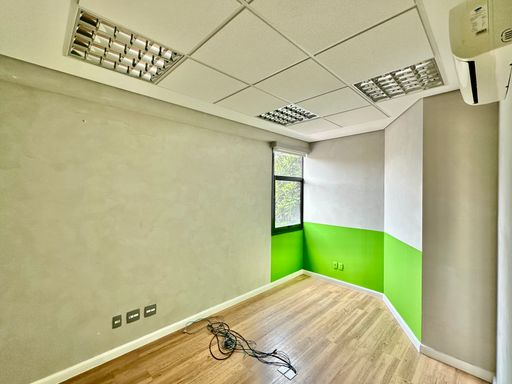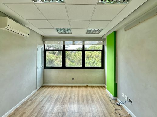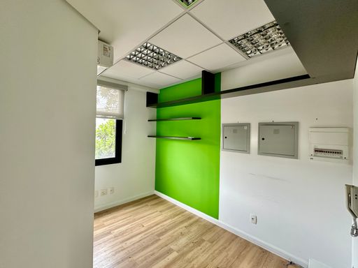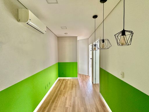 Na configuração atual, o imóvel conta com uma recepção e corredor de acesso, três salas bem iluminadas, todas com janelas e agradáveis vistas, seja para a área verde aos fundos ou para a lateral voltada à rua, além de uma copa funcional e um banheiro privativo. O piso vinílico foi instalado sobre o porcelanato, oferecendo conforto térmico e acústico, e o ar-condicionado tipo split atende todos os ambientes, garantindo bem-estar no dia a dia. A sala é entregue com todos os acabamentos prontos, incluindo luminárias, estando em condições ideais para uso imediato. O conjunto ainda dispõe do direito a uma vaga no estacionamento do prédio.