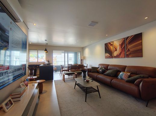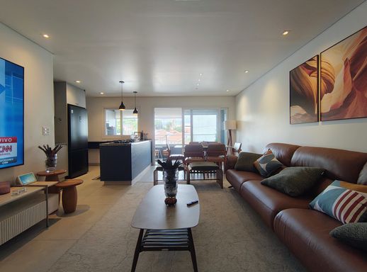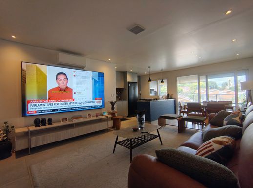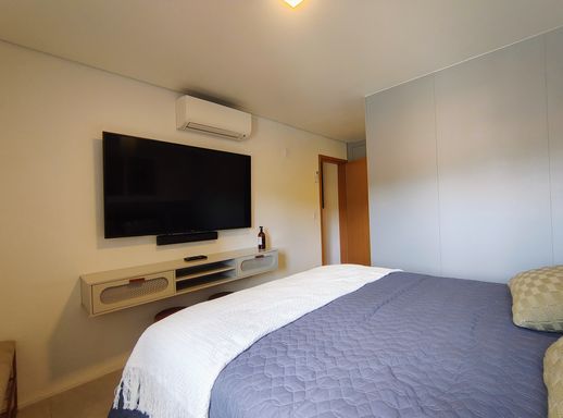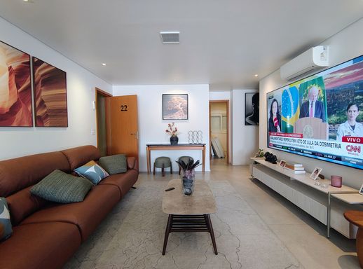 Ao entrar, você encontra salas integradas que harmonizam estar, jantar e TV, todas equipadas com móveis planejados, criando um ambiente funcional e acolhedor, com ar condicionado .
