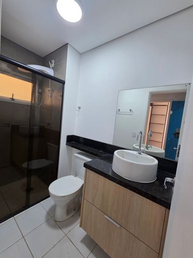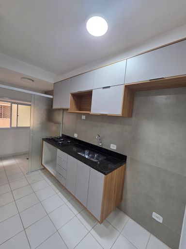 A cozinha possui estilo moderno, equipada com cooktop e móveis planejados que otimizam o espaço. O banheiro é elegante e funcional, com gabinete, bancada em mármore e box de vidro.