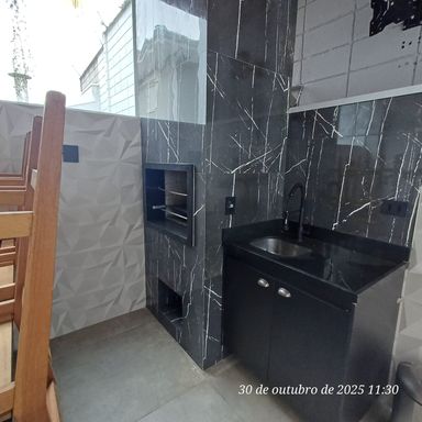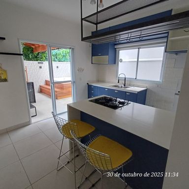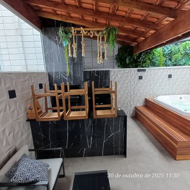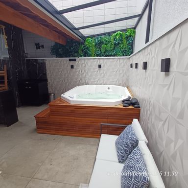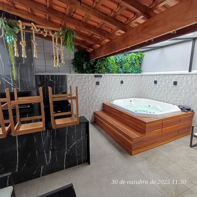 Nos fundos, um verdadeiro refúgio de lazer: quintal com jacuzzi privativa, churrasqueira e área coberta com alguns móveis, ideal para momentos de relaxamento e confraternização com a família e amigos.