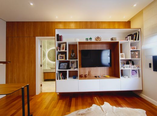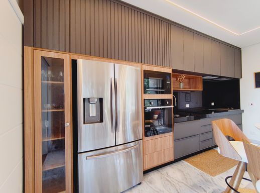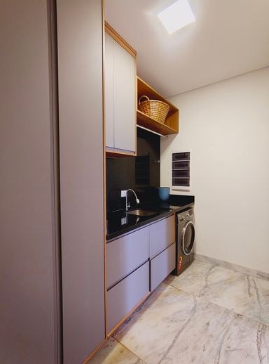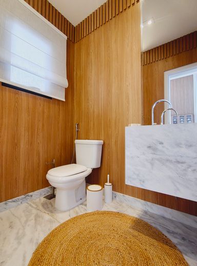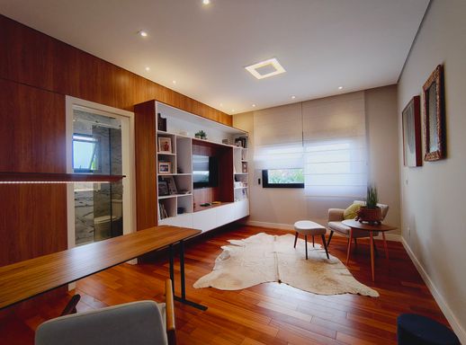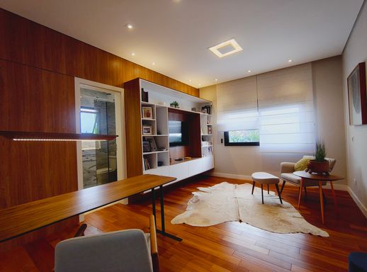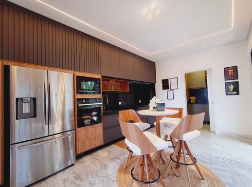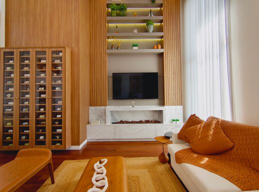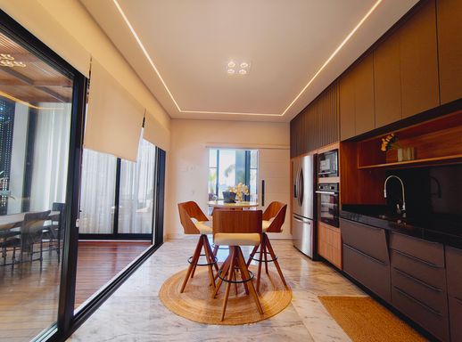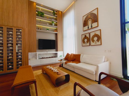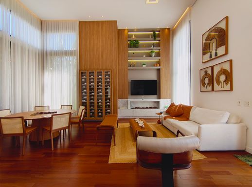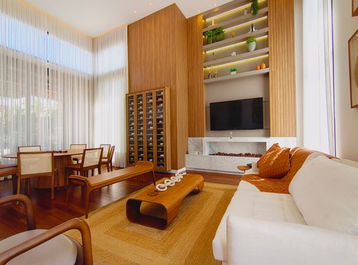 A área social é elegante e acolhedora, com destaque para a lareira a gás com pedras vulcânicas, perfeita para momentos de convivência. A integração dos ambientes valoriza ainda mais a amplitude e a funcionalidade da casa.
