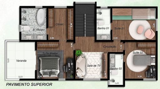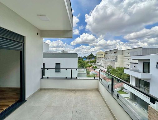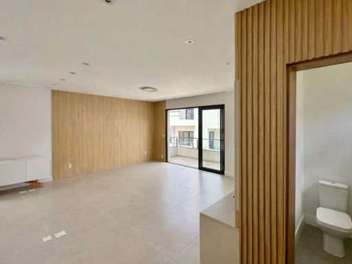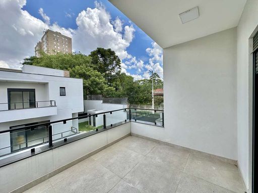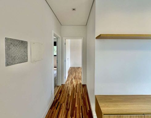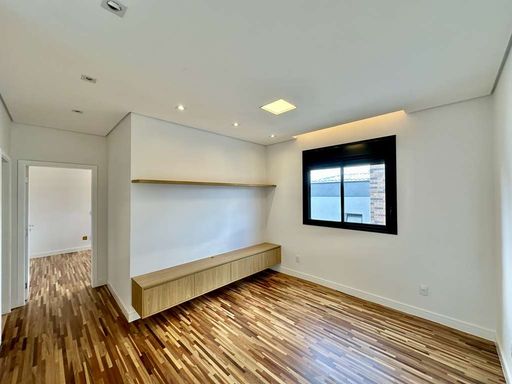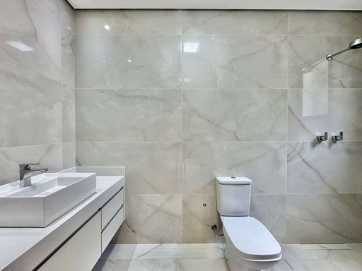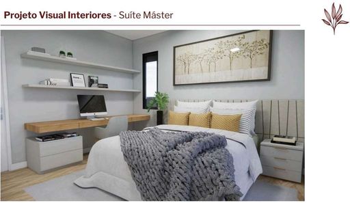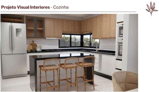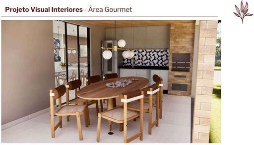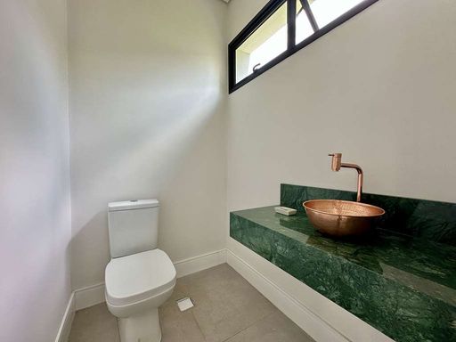 A varanda gourmet é planejada, com armários, bancada em “L” em pedra São Gabriel, cuba inox, torneira gourmet e ilha com balcão. No piso superior, há um hall íntimo com espaço para TV ou escritório, reversível para um quarto dormitório. São três suítes, sendo a master com closet e terraço. Os banheiros possuem revestimento em porcelanato até o teto, com louças e metais de qualidade, sendo a suíte principal com duas cubas.