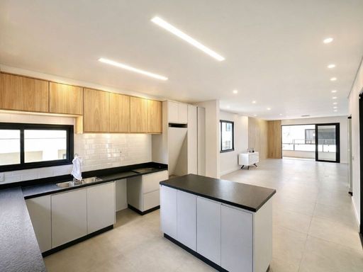 A área de serviço conta com espaço aberto ensolarado e lavanderia fechada planejada com armários, bancada em granito e tanque inox. Há ainda apartamento de serviço com acesso externo, além de depósitos diversos. A garagem coberta comporta quatro veículos.