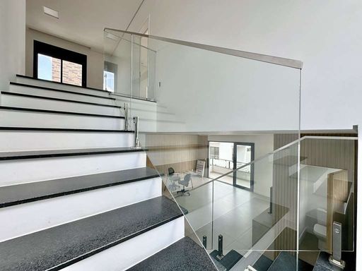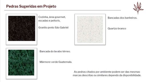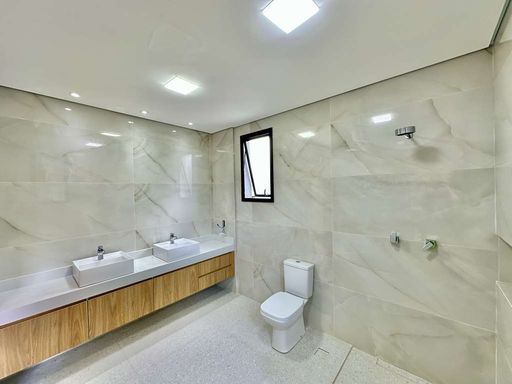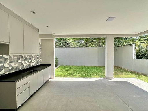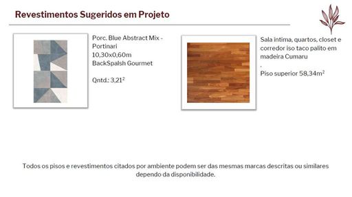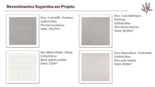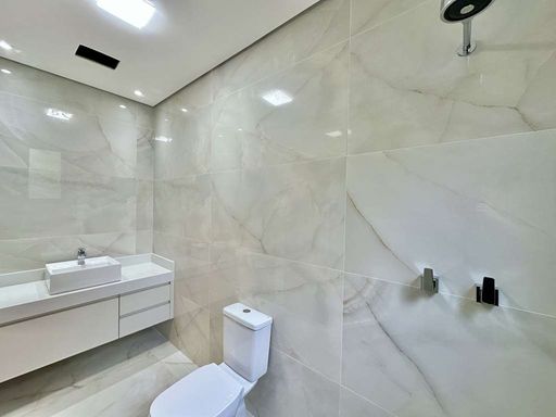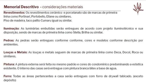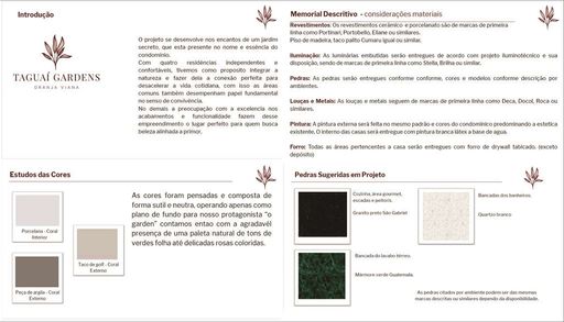 A casa possui acabamentos de alto padrão, com pisos em porcelanato, incluindo áreas externas com antiderrapante, fulget e tacos de madeira na área íntima. Escadas, cozinha e varanda gourmet contam com tampos em pedra São Gabriel escovada. Portas e janelas em alumínio preto valorizam o design contemporâneo, enquanto as portas com isolamento termoacústico garantem conforto. Conta ainda com projeto de gesso e iluminação, louças e metais de qualidade e telhado em Steel Frame com telhas ecológicas.