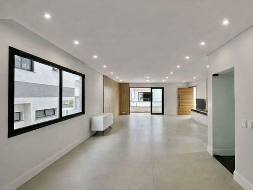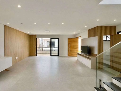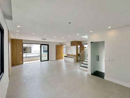 Com três acessos independentes, social, lazer e serviço, a entrada principal é feita por escada externa em fulget, levando à porta pivotante em madeira. O hall possui lavabo com tampo em mármore e torneira estilo cobre. O living é amplo e integrado para quatro ambientes, incluindo estar, TV, jantar e bar, conectado à cozinha, varanda gourmet e terraço com guarda-corpo de vidro e metal.
