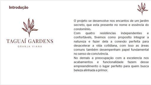 Localizada no exclusivo condomínio Taguaí Gardens, com apenas quatro casas modernas, esta residência se destaca pela excelente localização, a cerca de 1.000 metros do The Square Open Mall e Dona Deola, em uma das ruas mais charmosas da Granja Viana, próxima aos melhores comércios e serviços da região. O imóvel oferece vista privilegiada com ótima privacidade, aliando conforto, sofisticação e praticidade.
