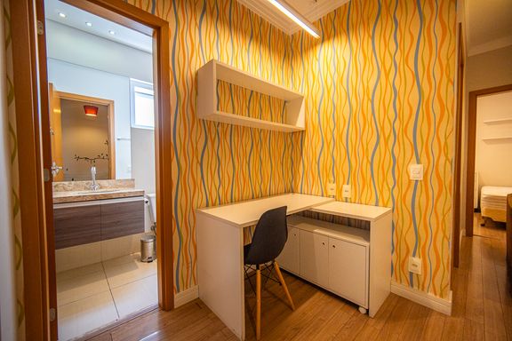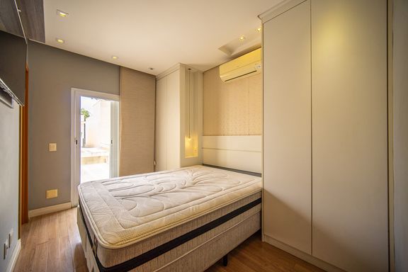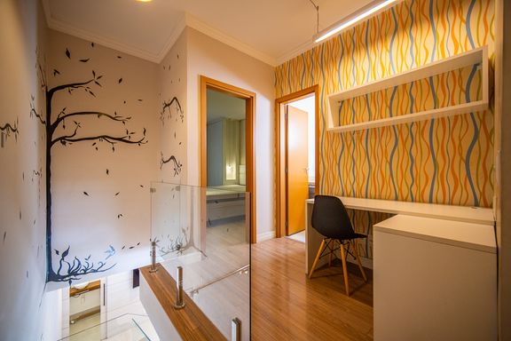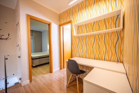No andar superior o imóvel possui três quartos sendo uma suíte com sacada Todos os quartos contam com armários planejados além de roupeiro no corredor garantindo organização e praticidade