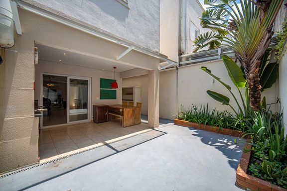A residência dispõe ainda de corredor lateral coberto com vidro que dá acesso à lavanderia e ao quintal além de garagem coberta para dois carros