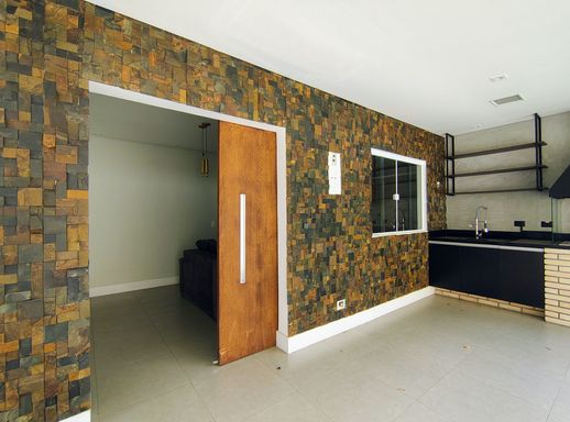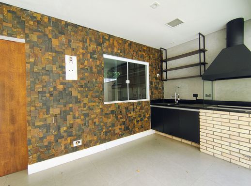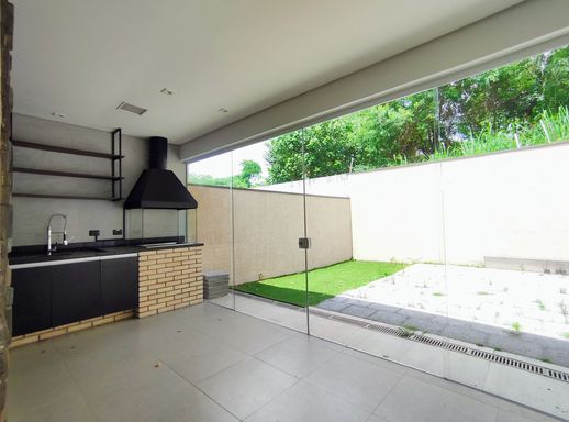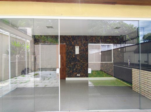 Na área externa, o quintal gramado oferece um espaço generoso, complementado por uma área gourmet com churrasqueira, perfeita para reunir amigos e familiares em ocasiões especiais, com um espaço corredor lateral com fechamento em vidro
