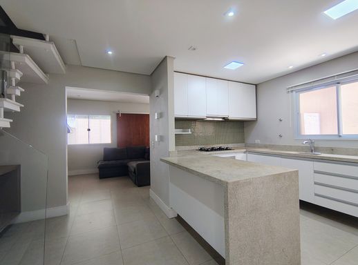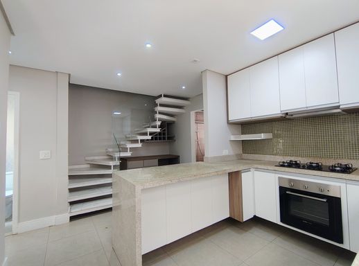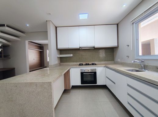 Ao entrar, você encontra uma cozinha prática e funcional, em conceito aberto, equipada com armários planejados , forno e fogão.