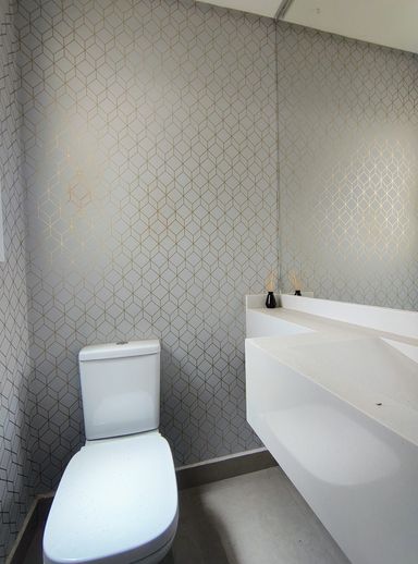 Ao lado, a lavanderia, garantindo organização e praticidade. Um lavabo que atende a este andar.