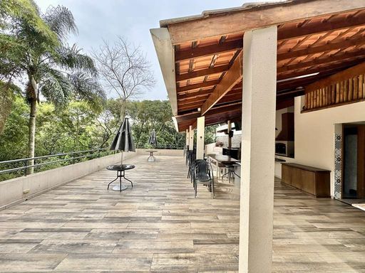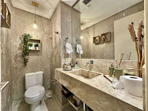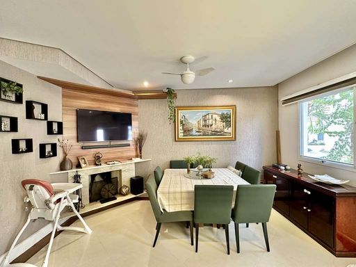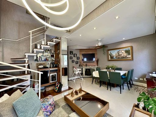 O living é amplo e integrado, ideal para momentos em família ou com amigos, comportando cinco ambientes compactos e confortáveis. Com ventilador e ar-condicionado, ele inclui áreas de estar, TV com lareira, jantar e bar, tornando-se o coração da casa. O lavabo decorado, com grande espelho e acabamentos em mármore Travertino, agrega um toque de elegância.
