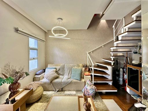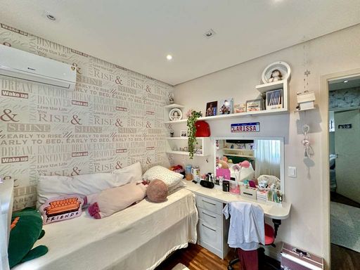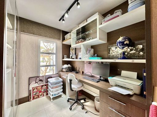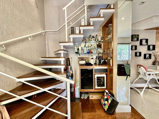 No piso superior, uma escada com estrutura de ferro revestida de madeira, complementada por um corrimão de ferro, leva a um hall íntimo e a um mezanino planejado para home office, repleto de armários e uma estação de trabalho. Os três dormitórios são planejados e equipados com ar-condicionado, sendo um deles uma suíte com terraço, proporcionando conforto e privacidade. Os banheiros apresentam claraboias que garantem iluminação natural, além de espelhos, gabinetes, tampos em Travertino, cubas de vidro e box de vidro até o teto.