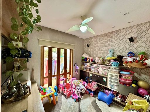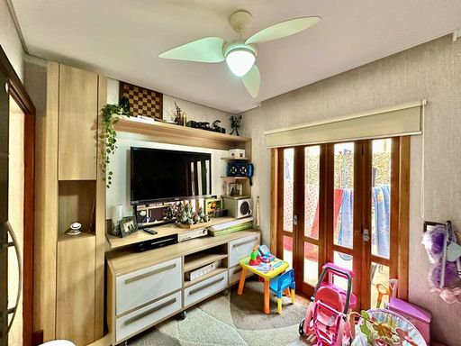 A sala íntima, planejada e voltada para a varanda fechada, é perfeita para um home theater ou para momentos de relaxamento, equipada com painel para TV, prateleiras e ventilador. A varanda fechada se integra à área de serviço, que conta com canteiros e plantas, criando um pequeno espaço gourmet ideal para uma churrasqueira portátil.