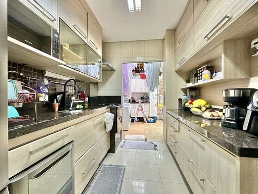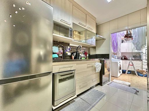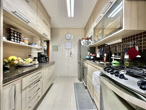 A cozinha planejada é um sonho para quem gosta de cozinhar, repleta de armários e equipada com uma porta vai e vem com visor escotilha, tampo em granito, pia de inox e gabinetes funcionais. A área de serviço é igualmente bem planejada, com lavanderia fechada, armários, gabinetes, tanque e tampo em granito, garantindo praticidade no dia a dia.