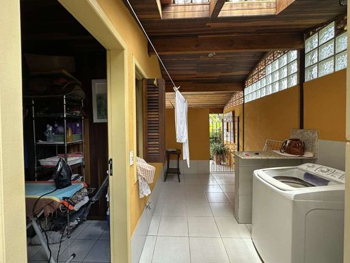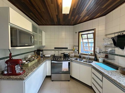A copa cozinha planejada é funcional e bem iluminada, com armários, bancadas em granito e duas cubas inox, com agradável vista para o jardim. A área de serviço conta com lavanderia fechada, depósito, quarto e banheiro de serviço, além de acesso independente. Um escritório ou consultório com entrada externa lateral permite uso profissional ou home office com total privacidade.