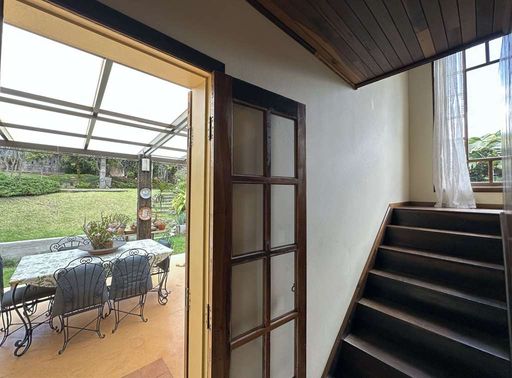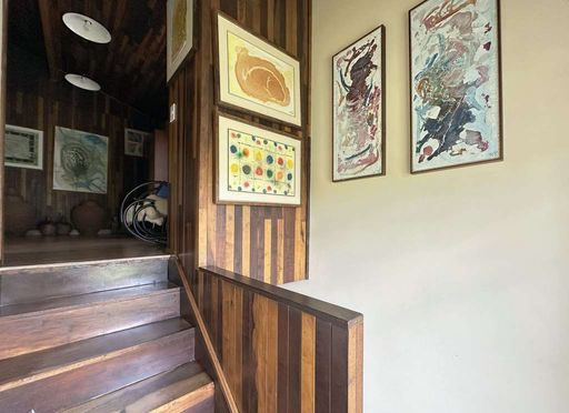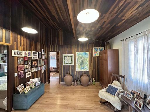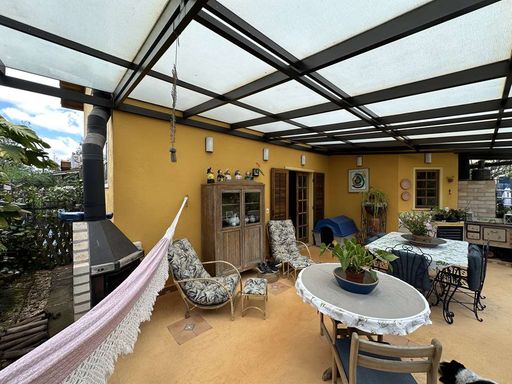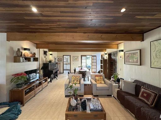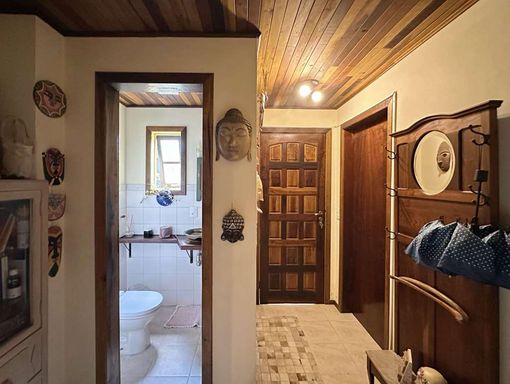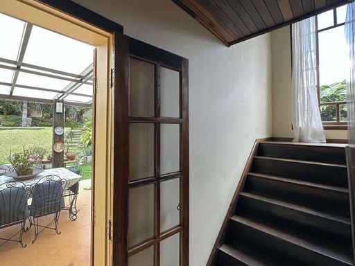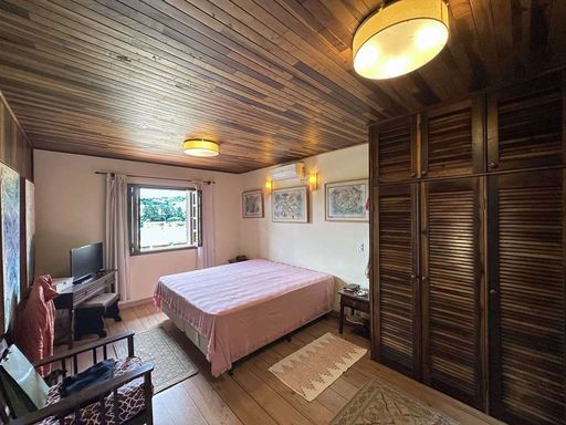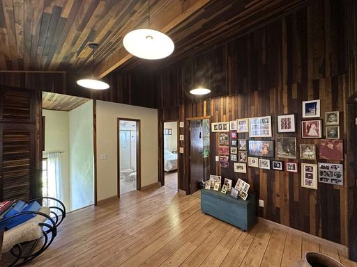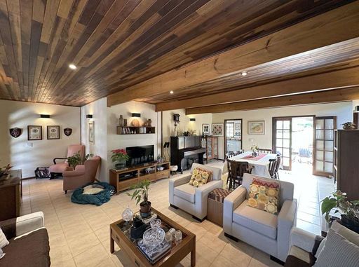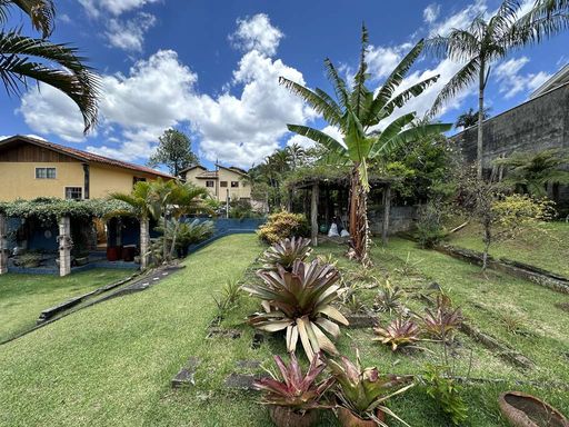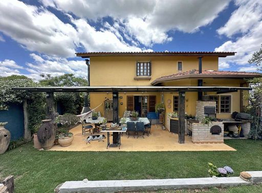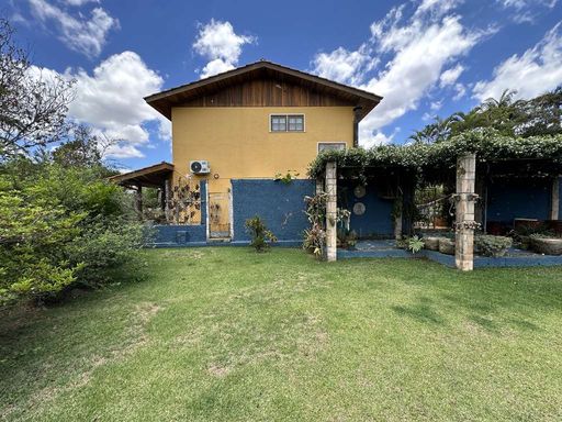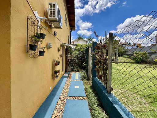 Com construção mista em alvenaria e madeira de lei (imbuia), a casa encanta pelo estilo acolhedor e pela integração com o jardim. O paisagismo formado conta com frutíferas, amplas áreas gramadas e gazebos, além de grande potencial para a construção de piscina, spa, espaço gourmet completo ou até mesmo uma casa de hóspedes, tornando o imóvel extremamente versátil.
