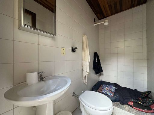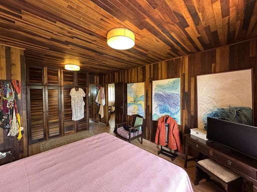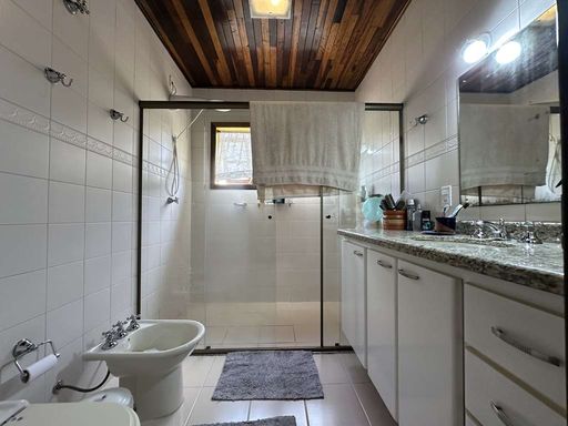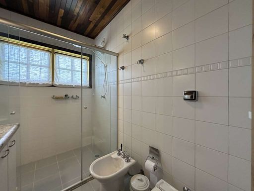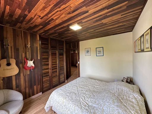 No piso superior, a área íntima possui paredes internas em madeira, trazendo ainda mais aconchego. São três dormitórios com armários e vista para o verde, sendo uma suíte com ar-condicionado, closet e bay window. Os banheiros possuem acabamentos de qualidade, com tampos em granito, gabinetes e box de vidro.