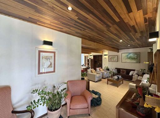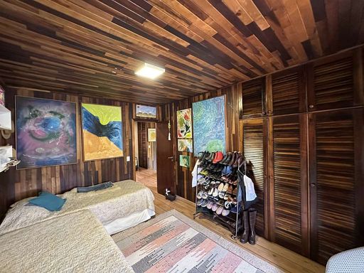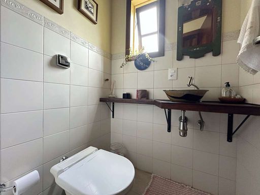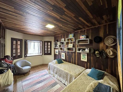 No piso superior, acessado por escada de madeira, a área íntima possui paredes em madeira, hall com roupeiro e espaço para TV. São três dormitórios com armários e vista, sendo uma suíte com ar-condicionado, closet e bay window. Os banheiros contam com tampos em granito, gabinetes e box de vidro.