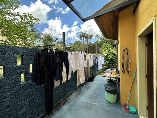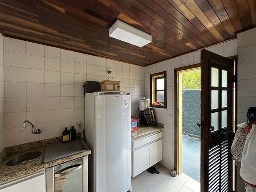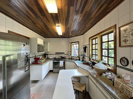 A copa-cozinha é planejada, com muitos armários, bancada em granito e duas cubas inox, com vista para o jardim. A área de serviço inclui espaço aberto ensolarado, lavanderia fechada integrada, depósito e dependência de serviço.