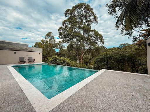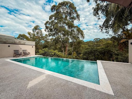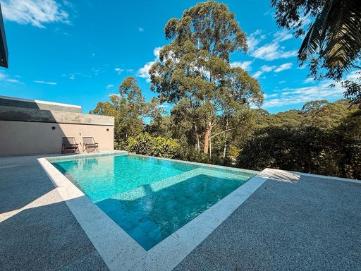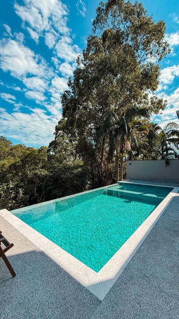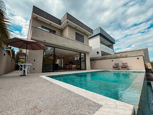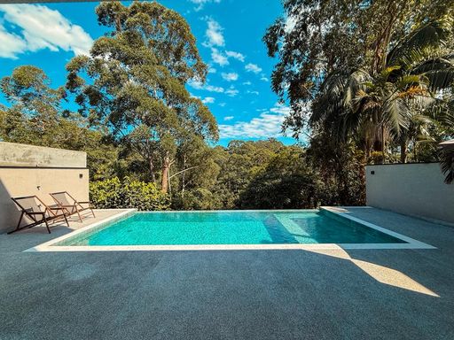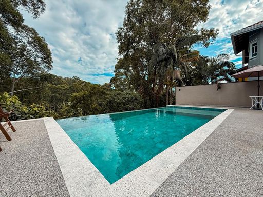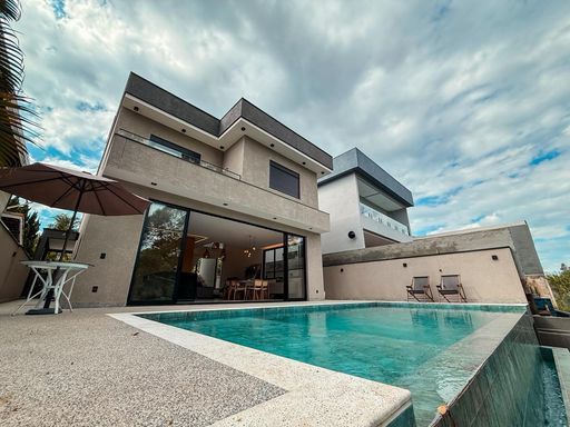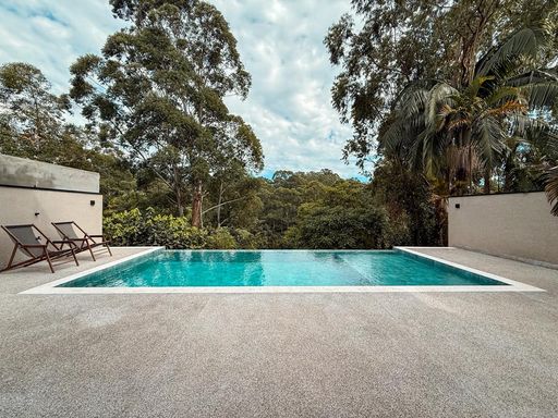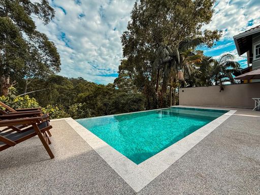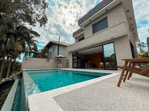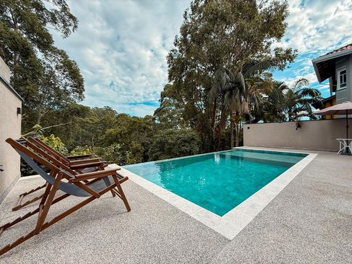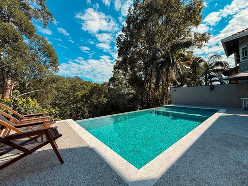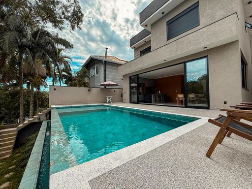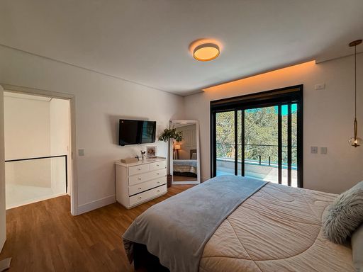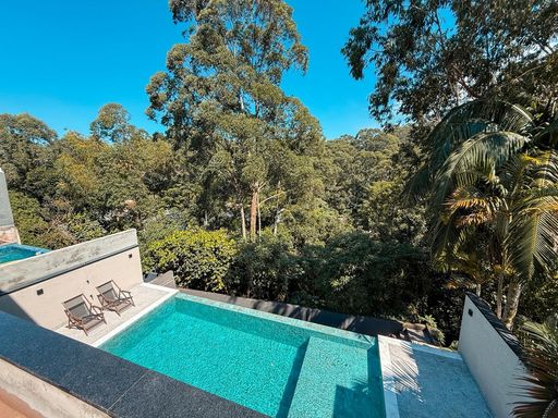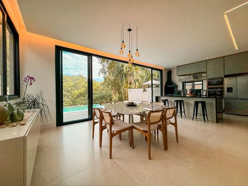 A cozinha planejada é um dos destaques, equipada com ilha, torre quente e geladeira, integrando-se perfeitamente ao espaço gourmet. A área externa oferece um espaço gourmet com churrasqueira a carvão, além de uma piscina com prainha e borda infinita, com uma agradável vista para a reserva, criando um ambiente único para lazer e relaxamento.