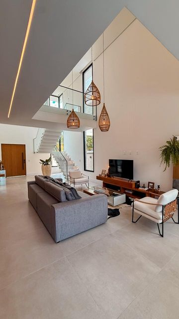 A área social apresenta um living amplo para três ambientes — estar, TV e jantar — com pé-direito duplo, que valoriza a sensação de amplitude e elegância. O imóvel conta ainda com escritório, ideal para home office ou estudos.