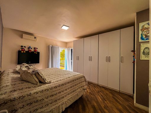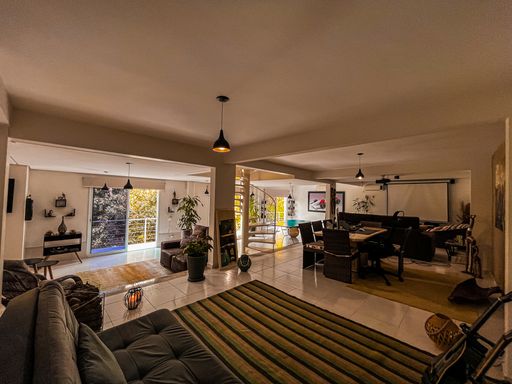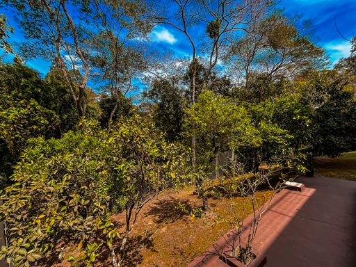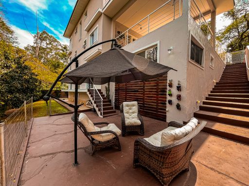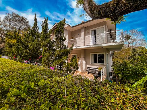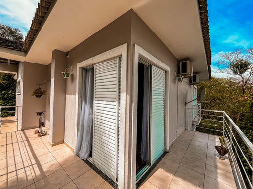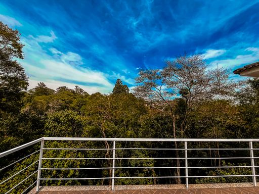 O layout da casa é espaçoso e funcional, começando pelo living com lareira, perfeito para momentos aconchegantes. As salas de estar e de jantar são integradas, proporcionando um ambiente acolhedor para receber amigos e familiares. Com quatro quartos, todos com varandas, sendo duas suítes, o imóvel garante conforto e privacidade para todos os moradores. O terraço, com vista para a área de preservação, é ideal para relaxar e apreciar a natureza. A cozinha planejada está equipada para facilitar o dia a dia, enquanto a lavanderia possui armários e há também uma dependência de funcionários.