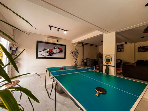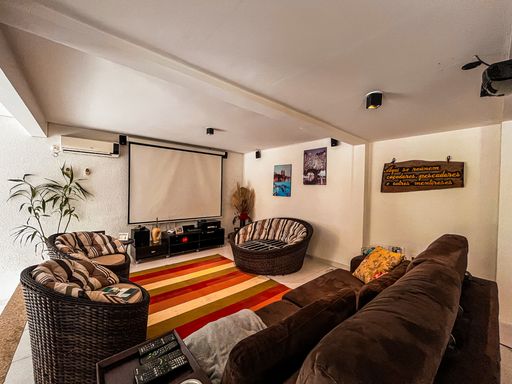 A área de lazer é completa, com um salão de festas integrado e um salão de jogos, ideal para entretenimento. Para aqueles que trabalham em casa, o espaço conta com um home office e um cinema room, proporcionando versatilidade para o trabalho e lazer. O jardim, que inclui uma horta e um pomar, promove um estilo de vida sustentável, e o acesso à área de preservação permanente, com riacho e lago, é um convite à tranquilidade.