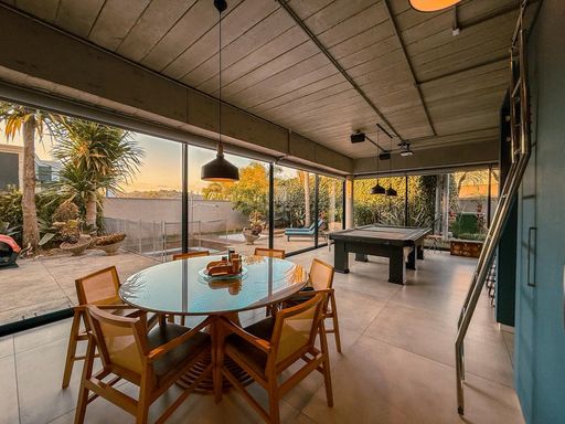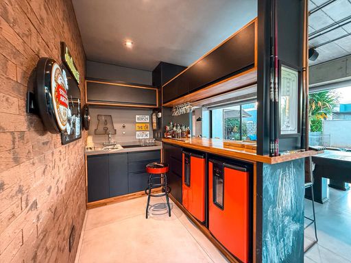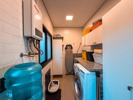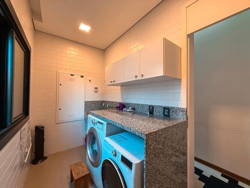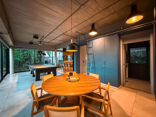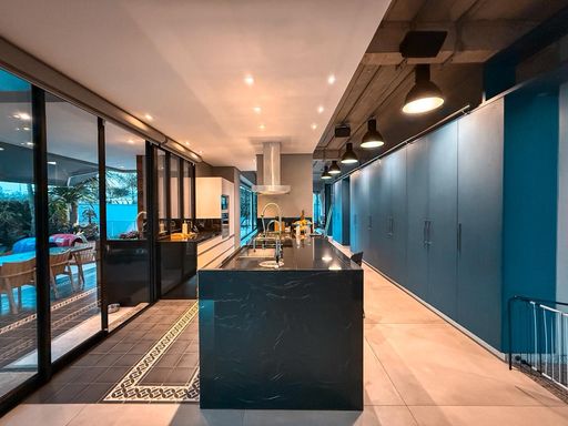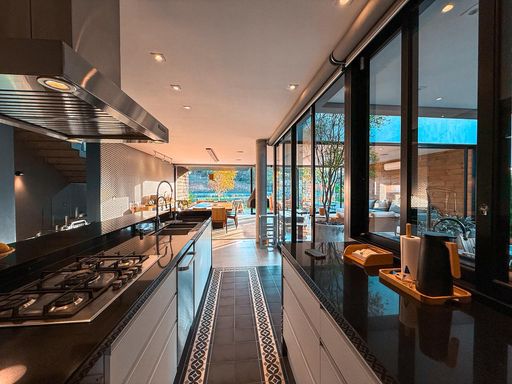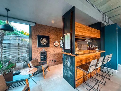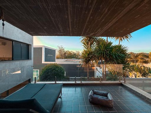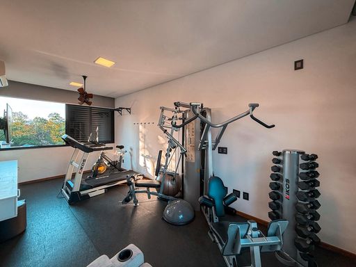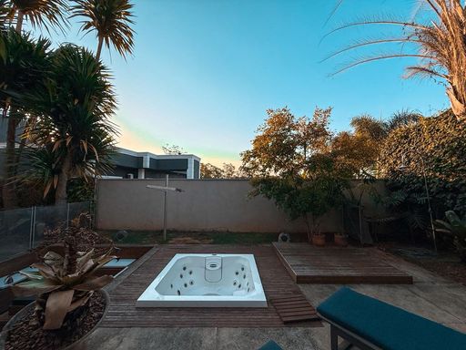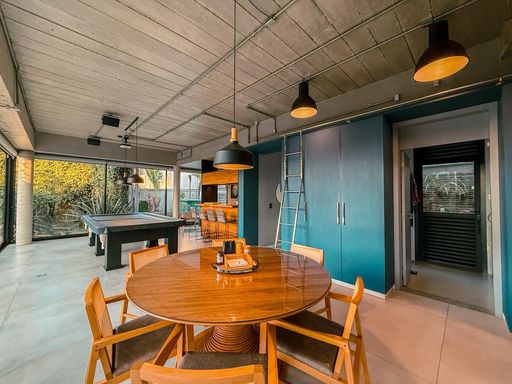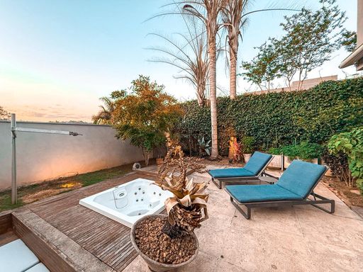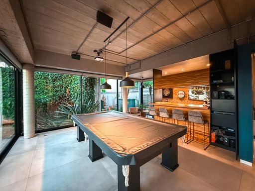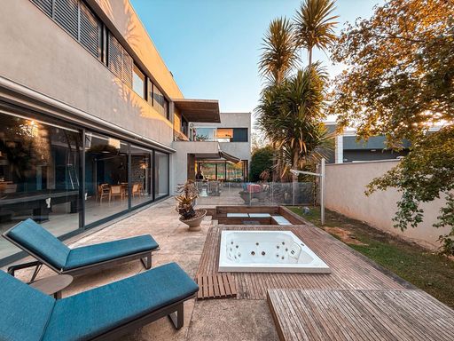 A área de lazer privativa traz o aconchego e praticidade que uma rotina moderna exige, reunindo espaço gourmet com churrasqueira, jacuzzi e um amplo quintal que permite vivenciar momentos de descanso ou confraternização com amigos e familiares. A casa também possui salão de festas com lounge bar, academia equipada, lavanderias independentes e suíte de serviço, atendendo plenamente às demandas de quem busca funcionalidade sem abrir mão de conforto. A garagem comporta até nove veículos, sendo seis vagas cobertas, o que agrega praticidade ao dia a dia.