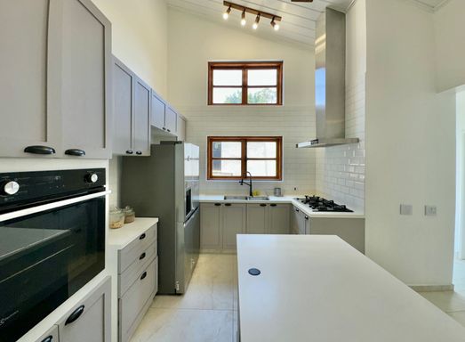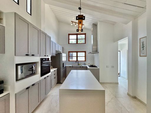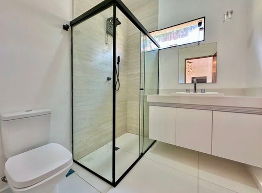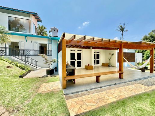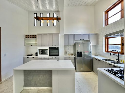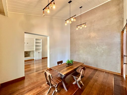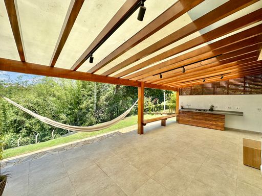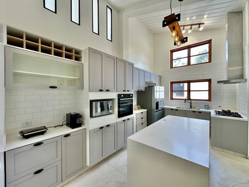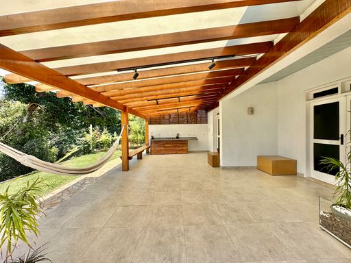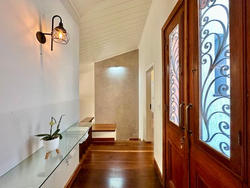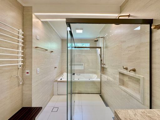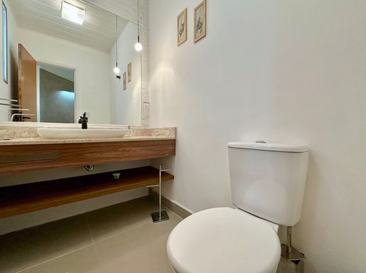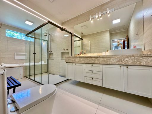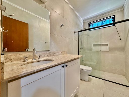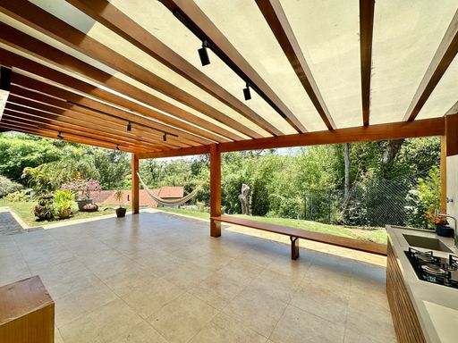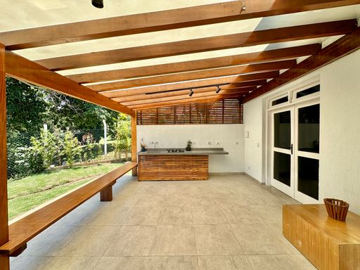 A cozinha é totalmente planejada e equipada, dispondo de geladeira nova de 611 litros, cooktop de cinco bocas, coifa e forno elétrico de 80 litros, oferecendo praticidade e conforto no dia a dia. A lavanderia possui acesso ao quintal e conta com área externa coberta, além de quarto e banheiro de serviço que garantem maior funcionalidade à casa. O sistema de aquecimento central por boiler atende os banheiros e a cozinha, proporcionando mais conforto térmico.