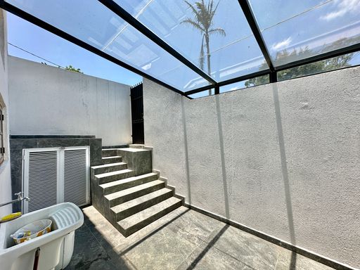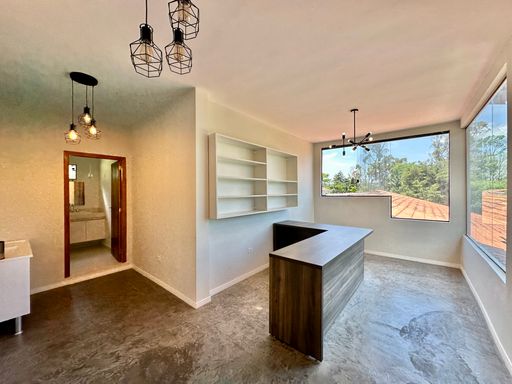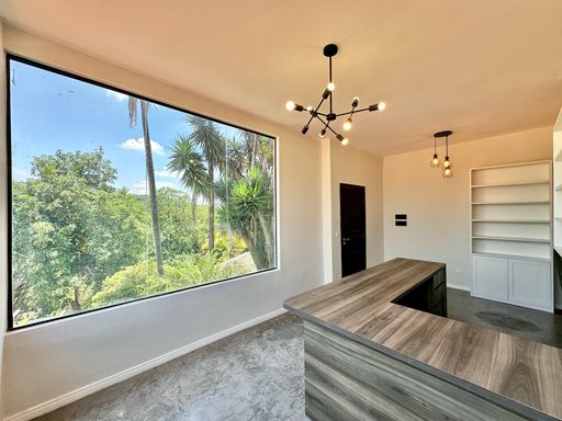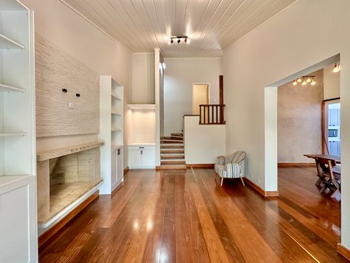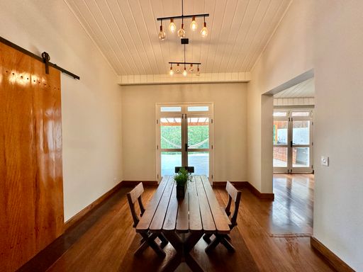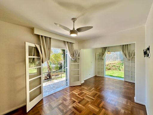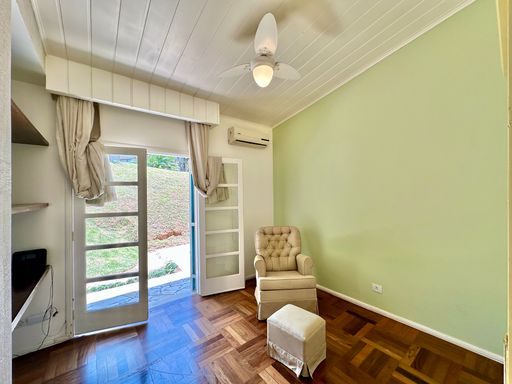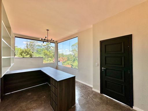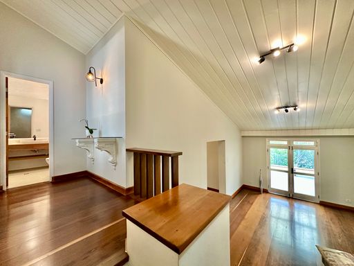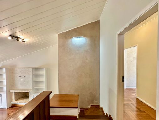 Na área íntima, o imóvel conta com quatro dormitórios, sendo uma suíte máster com closet. No piso superior, há ainda um escritório com acesso pela escada do terraço, que pode ser facilmente adaptado como suíte de hóspedes, pois dispõe de banheiro completo. A casa oferece garagem para seis veículos, sendo duas vagas cobertas, atendendo perfeitamente famílias que valorizam espaço e comodidade.